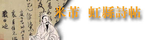 此卷为米芾途经风光明媚的虹县(今安徽泗县)时,挥毫写就的两首自作七言诗。纸本墨迹卷,共三十七行, 每行二、三字不等。米芾的大字行书传世极少,而这件又是其最晚年的大字代表作,因而十分珍贵。米芾尝自称其书为“刷字”,这一点在他的大字中表现得比较明显。该帖轻重缓急,节奏感极强, 用墨则干湿浓淡,浑然一体,得天成之趣。如起首“ 虹县旧题云快霁一天清淑 ”十一字,一气呵成,笔虽干而不散。帖后有金大定十三年刘仲游跋。原作见于2006年上海博物馆《中日书法珍品展》。