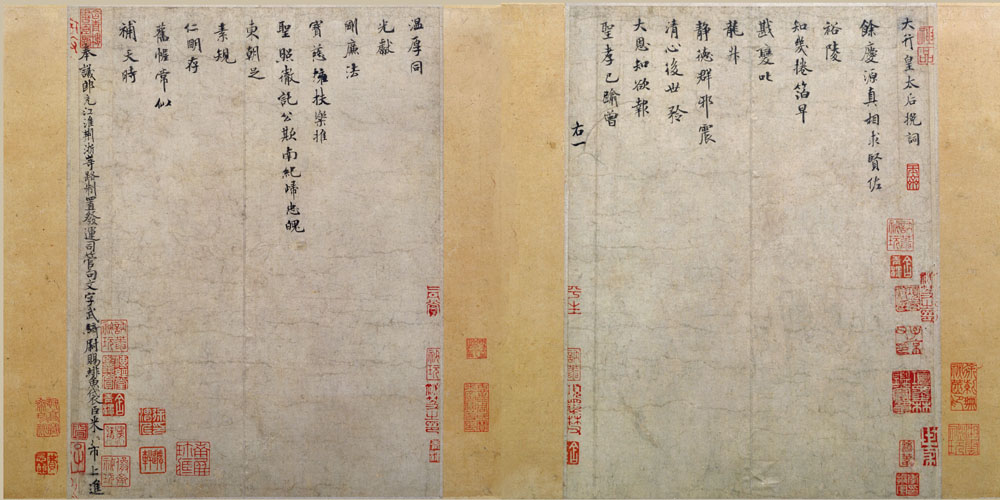 米芾《向太后挽词帖》是其五十一岁时所书。其结字介于行楷之间,笔法精炼,正如前人所说:“研笔如铁,而秀媚之气奕奕行间,风华类得大令(王献之)之神,是南宫得意笔。”米芾这样精致的小楷是极为少见的。叶恭绰记《宋米元章〈向太后挽词〉》载:“米元章书法,以小楷为最佳,但现存仅一件,即《向太后挽词》也。其实,亦系行楷。此物,以前未入过元、明、清三朝内府,以挽词犯忌讳也。”此《挽词》“本为端方所藏,后归景朴孙,又归袁珏生。袁去世后,转入鄞人周湘云手。闻与耶律楚材诗卷,均入故宫博物院矣”。