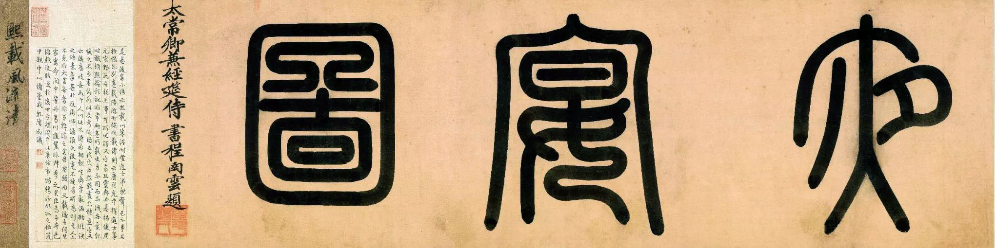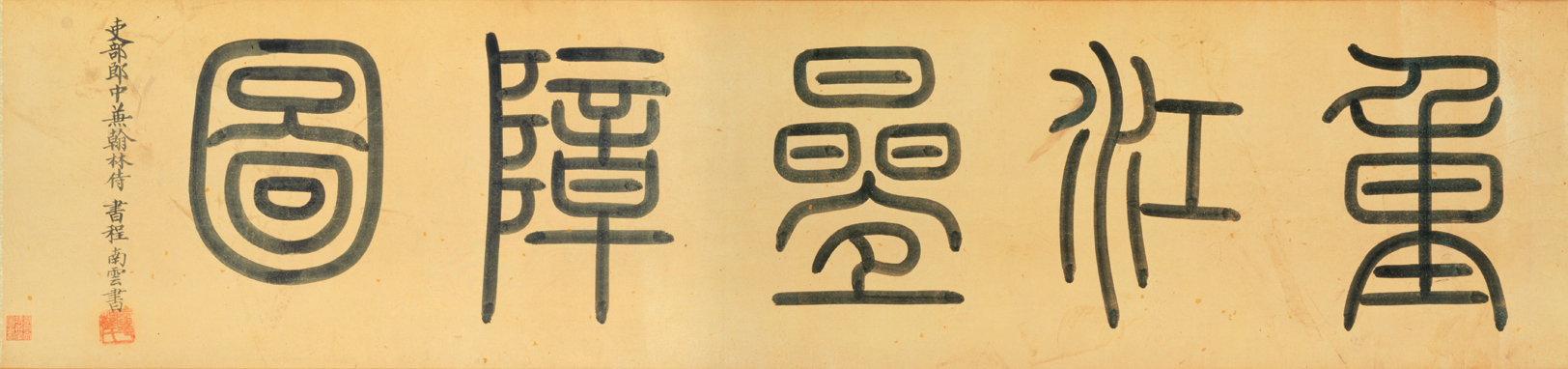 宣德九年(1434),收藏赵孟頫《重江叠嶂图》的李昶,请南京朝廷 中几位有名望的士人作题,程南云即是其一。这五字题在引首上,用小篆书写,运笔 力道均匀,结构严谨,力求笔画粗细与间隔平均,左右对称,在庄重之中带有悦目的 装饰性。