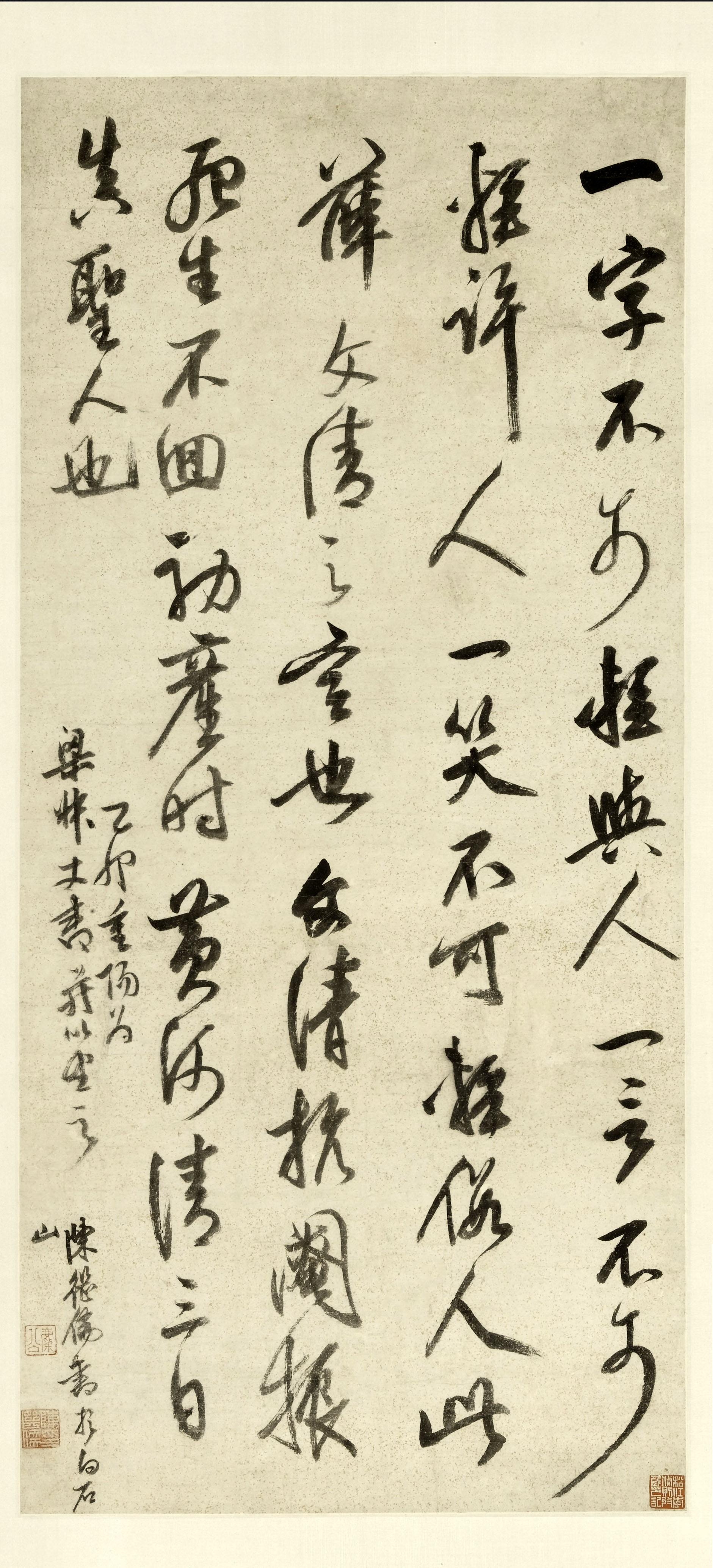 此作品系作者五十八岁时于白石山所书。录薛瑄之语。薛瑄因得罪宦官王振下狱,几至被杀。卒赠礼部尚书,谥文清。摘录薛瑄语,并加以褒赏,表明他反对宦官专权的政治见解。陈继儒主张学书“切忌紧逼”,要学而能化。《桐阴论画》评陈继儒书法在“苏米之间”。此幅书法字形伸张,用笔骏快,有米芾的“沉着飞翥”的神韵;浑厚敦朴,有苏轼的“敦庄沉着”的笔意。且更刚健峭刻,有自己的面目。(茅新龙)