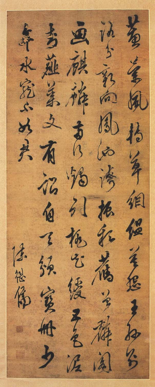 陈继儒《行书七言诗轴》绢本行书 141.6×55cm 湖南省博物馆藏 释文:蕙兰风转草絪缊,莫怨王孙别路分。新向凤池夸振彩,旧曾麟阁画麒麟。两行烛引桃花绶, 五色泥封薤叶文。 有诏自天颁宝册, 少年承宠不如君。 款署:陈继儒。 钤印:庶才公、陈继儒印