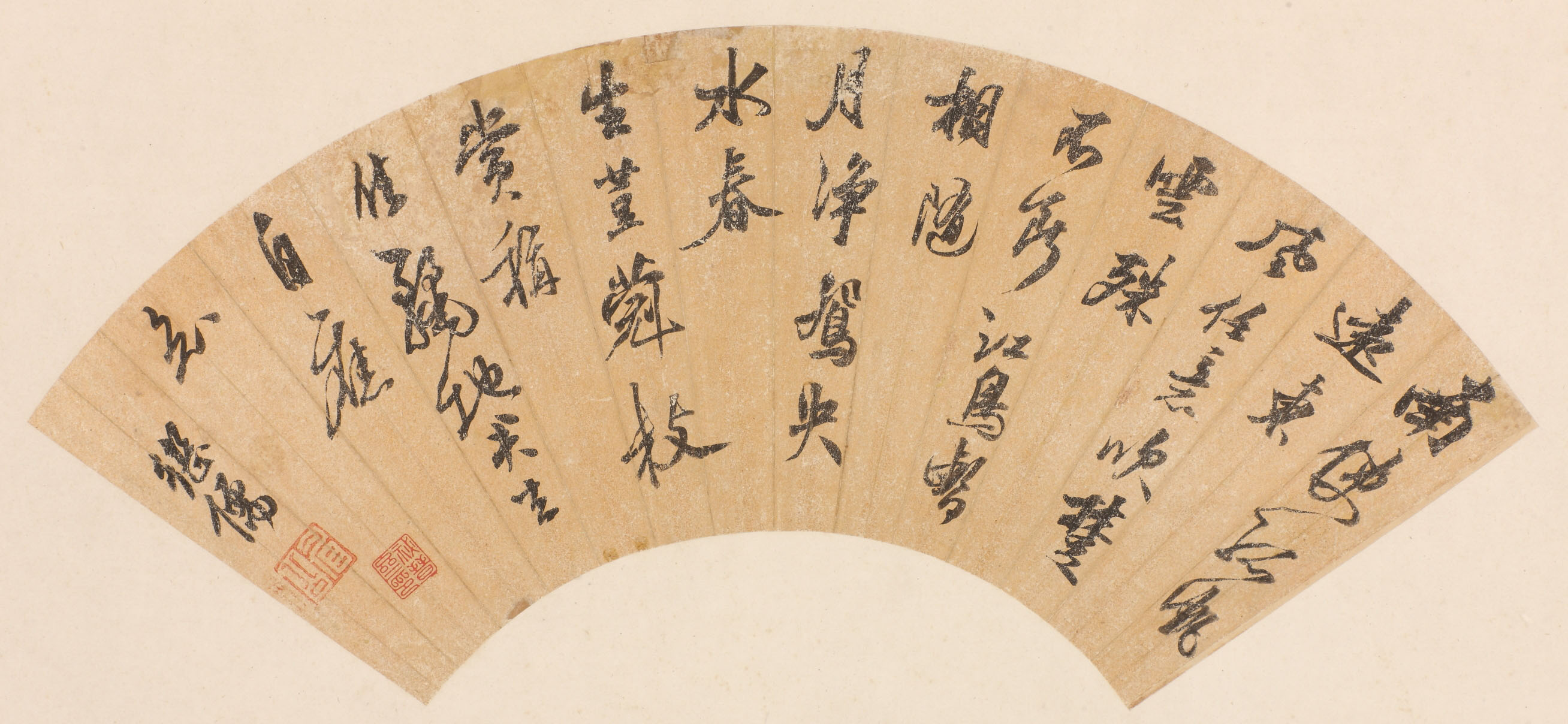 陈继儒《行书五律扇页》扇面 纸本行书 纵15,横46.5 无锡博物院藏 。 释文:南使孤帆远,东风任意吹。楚雲殊不断,江鸟暂相随。月净鸳央水,春生豆蔻枝。赏称佳丽地,君去自应知。 款识:继儒 钤印:眉公