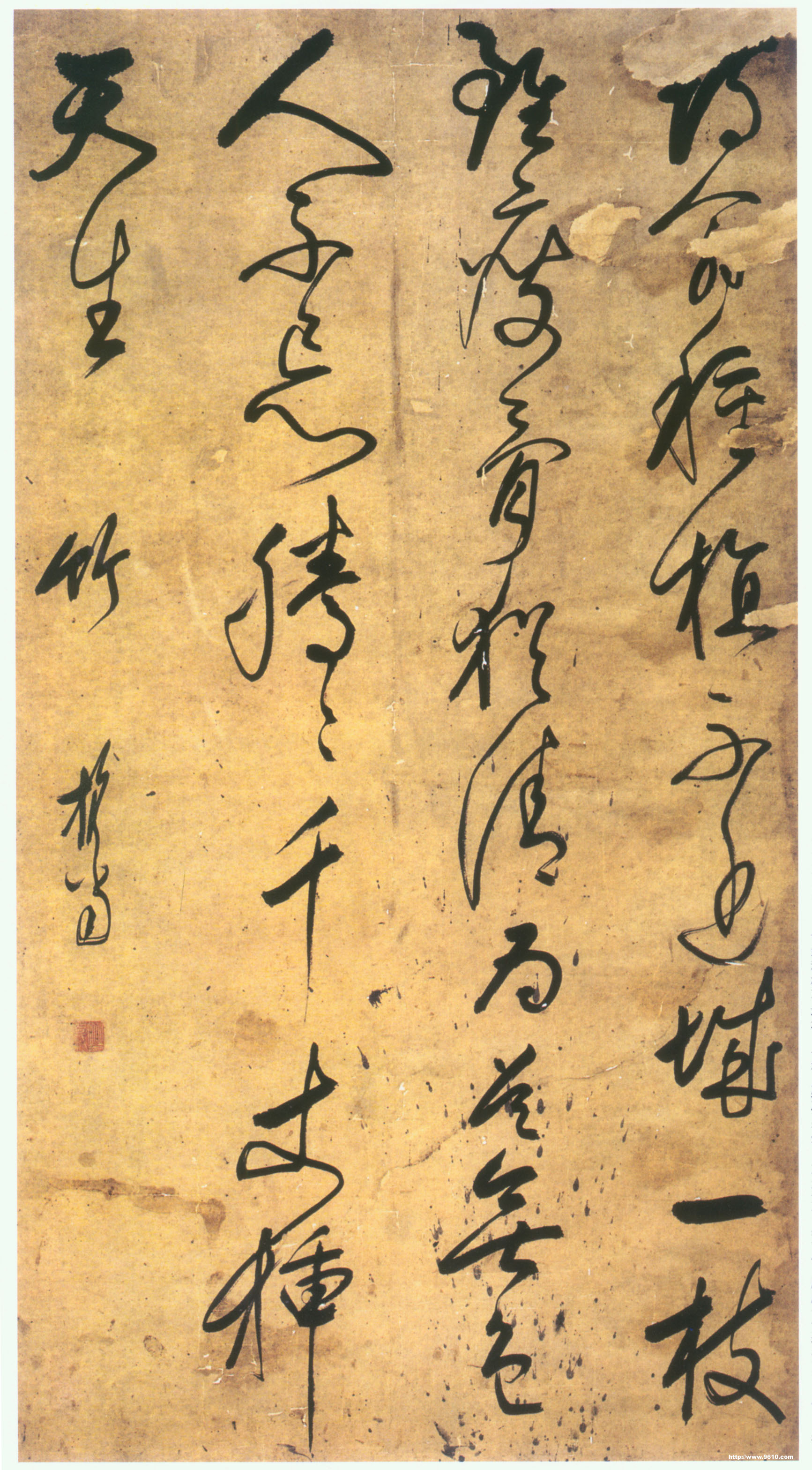 释文:诗翁种植不近城,一枝虽瘦骨犹清。为是无色人不忌,腾腾千丈插天生。 竹 担当
