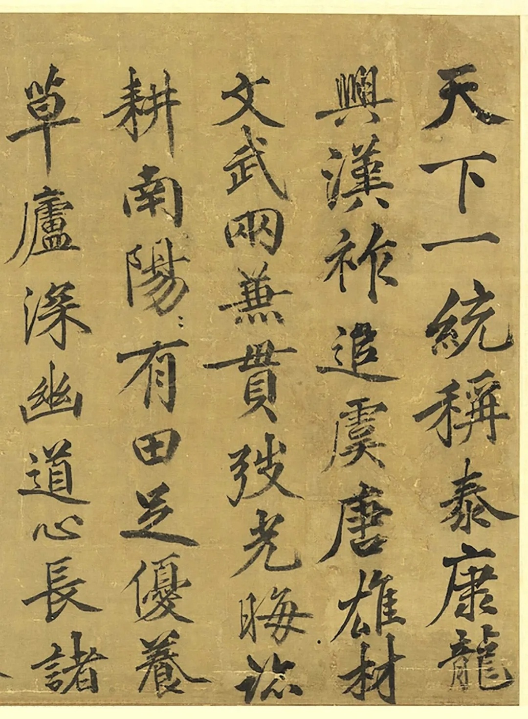 释文: 天下一统称泰康,龙兴汉祚追虞唐。雄材文武两兼贯,弢光晦迹耕南阳。南阳有田足优养,草庐深幽道心长。诸书韬略日披探,山水林塘乐清赏。一朝先主举义兵,就见准礼何其诚。准今酌古决大计,底蕴一展开忠精。阴阴绿树覆白石,杜门镇日无行迹。忽闻车盖山中来,野服纶巾惟谨敕。逢迎谈论机奥多,亹亹自若如悬河。削除暴乱定寰宇,运筹帷幄趋峦坡。竹扉山静晨光早,山僮闲把苍苔扫。金章紫绶织五花,红缨白马嘶芳草。鸿基定鼎开太平,不毛深入边尘清。统麾铁骑千百万,分符剖劵沾恩荣。前朝事业今何有,大明日月天同久。光昭万古良不磨,今代忠良尽勋旧。 方孝孺。