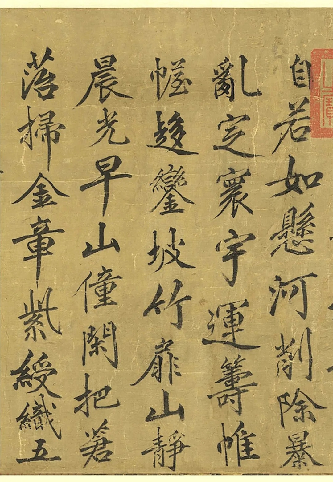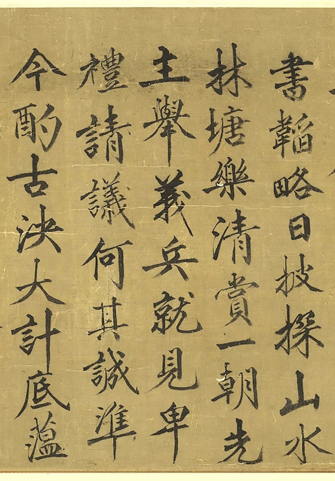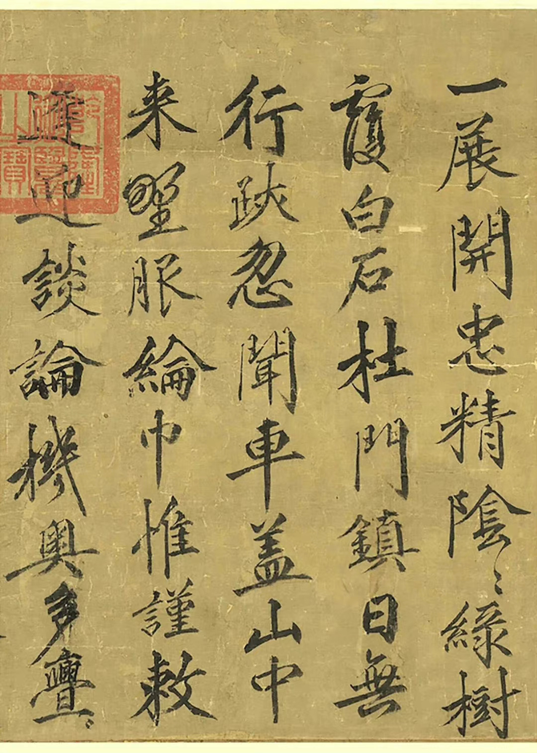 此幅为台北故宫博物院所藏李迪《三顾图》(传)的诗塘部分,行书。其书法铁画银钩,规矩中充满刚烈之气。