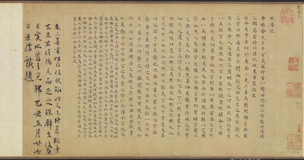 释文:默菴記。會稽俞先生。年富氣盛時。嘗以驚世絶俗之智。懸河決峽之辯。為當時所推。旣晚。更事益深。奉朝命為學者師於東南小邑。乃喜為簡黙。號其燕處之室曰黙庵。其弟子聞而疑之曰。先生之為斯號也。不亦異乎。人之達其志意。明天下之理。而成物化民者。以其能言也。故教令不宣于家。則親愛踈。辭命不脩於鄉。則長幼乖。軍旅不言。則無以用衆。賓客不言。則無以成禮。居乎朝廷。為大臣。而好循黙。則難以定國計。和民人。為諫官近職。而不務言事。則有曠官竊位之譏。先生為人師。以教民善俗為職業。封域之内。有細行之違。片言之悖。先生恥之。烏可以黙自處乎哉。余聞而咲曰。是知黙之為黙。而不知黙之非黙也。知言之不可止。而不知非黙則不能為言也。子嘗見夫萬仞之淵乎。方其静也。沉奫涵畜。不震不激。泊乎無聲。杳乎莫測。惟其積之久而不妄出也。故一旦決而為川。達乎江河。聲之所撼。聞數百里。使其不深。而終日汨汨。如溪潢澗潦之為。則不崇朝而涸矣。安能澤加萬類乎。故士非能言之為貴。而發於不得不言之為美。道充於中。不得已而後言。則其言必傳。無意於辨。不得已而後辨。則其辨必明。昔者孔子之門。以言語稱者有矣。惟顔子不言如愚人。然由後世考之。凡顔子之言。皆為天下準。與聖人之旨相表裡。而宰予子貢。發言立論。輙多疵而不適乎中。豈非好辨者未必能言。而善言者必本於黙乎。先生閱乎事變多矣。求乎義理精矣。知夫無益之辨之不足務。蓋將卽顔子而師之。而今而後。先生之道益隆矣。立乎朝。則發而為正論。垂乎後則揭而為大訓。皆有道者之餘事也。先生之黙。烏知非言之至者乎。二三子何患焉。於是疑者謝曰。子之言似矣。請質諸先生。置之屋壁。以袪弟子之惑。(自識行書)余不善書。偶得佳紙。錄此文未終篇。輒棄去。王君修德見而足之。珠璧在後。魚目奚所發其光邪。乙丑(1385年)五月廿七日。孝孺戲題。