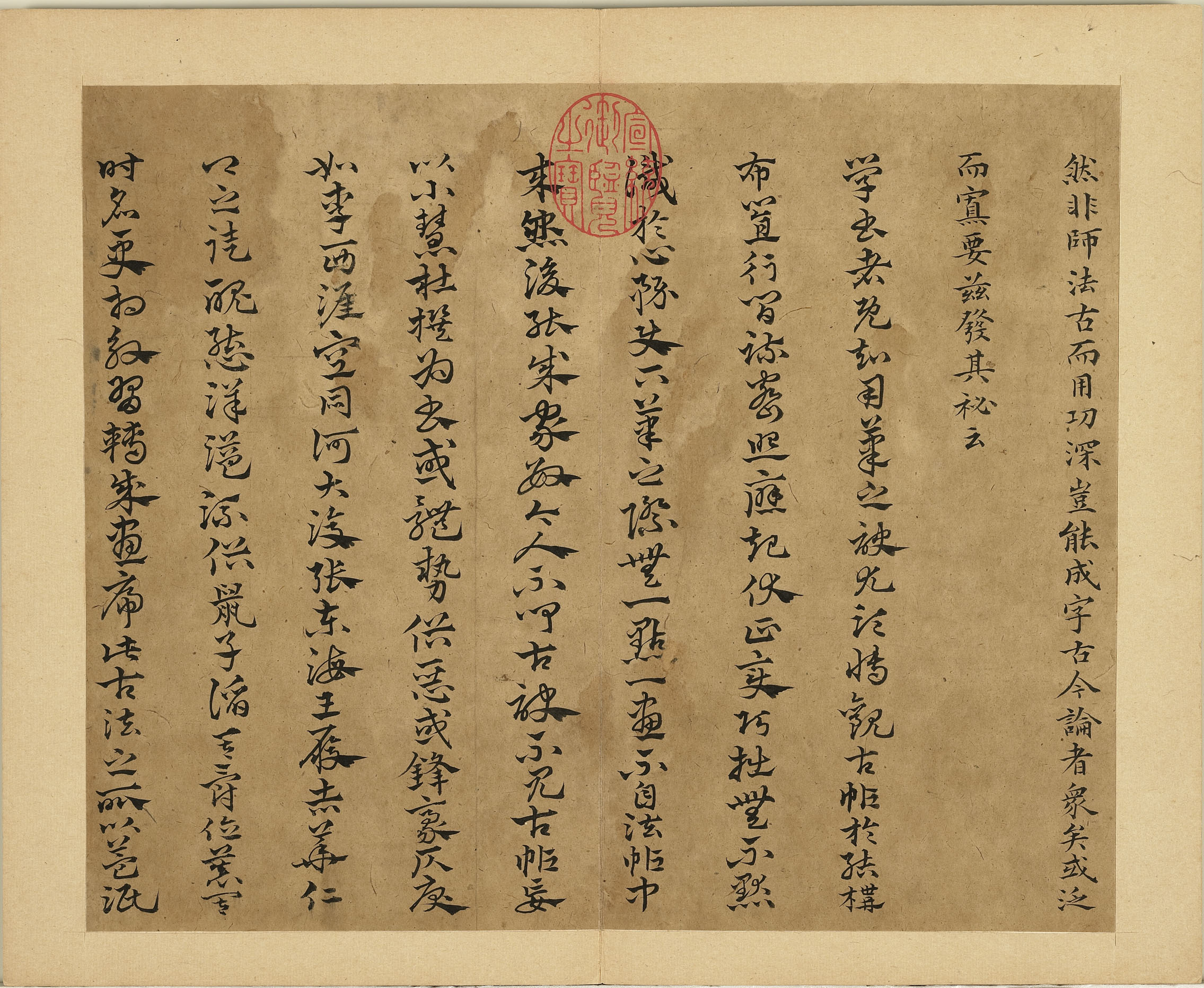 然非师法古而用功深。岂能成字。古今论者眾矣。或泛而寡要。兹发其祕云。(楷书)。学书者既知用笔之诀。尤须博观古帖。於结搆布置。行间疎密。照应起伏。正变巧拙。无不默识於心。务使下笔之际。无一点一画不自法帖中来。然后能成家数。今人不闻古诀。不见古帖。妄以小慧。杜撰為书。或体势俗恶。或锋毫仄戾。如李西涯空同何大復张东海王履吉华仁卿之徒。丑态洋溢。流俗鼠子。諂其爵位。慕其时名。更相效习。转成画虎。此古法之所益泯