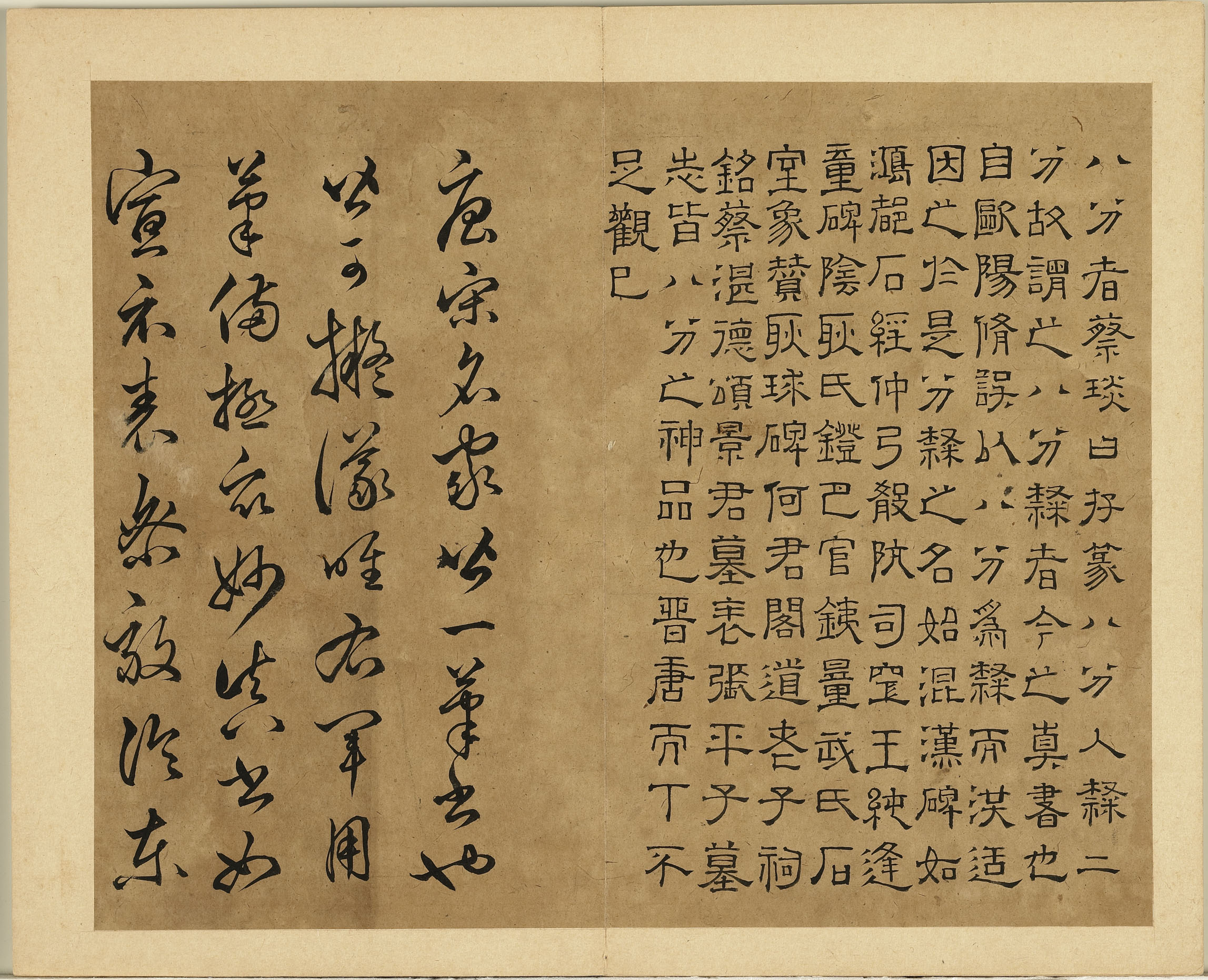 八分者。蔡文姬曰。存篆八分。入隶二分。故谓之八分。隶者。今之真书也。自欧阳修误以八分為隶。而洪适因之。於是分隶之名始混。汉碑如鸿都石经。仲弓殽阬。司空王纯逢童碑阴。耿氏鐙。巴官铁量武氏石室象赞。耿球碑。何君阁道老子祠铭。蔡湛德颂。景君墓表。张平子墓志。皆八分之神品也。晋唐而下。不足观已。(隶书)。唐宋名家。皆一笔书也。皆可拟议。唯右军用笔。备极眾妙。真书如宣示表。乐毅论。东