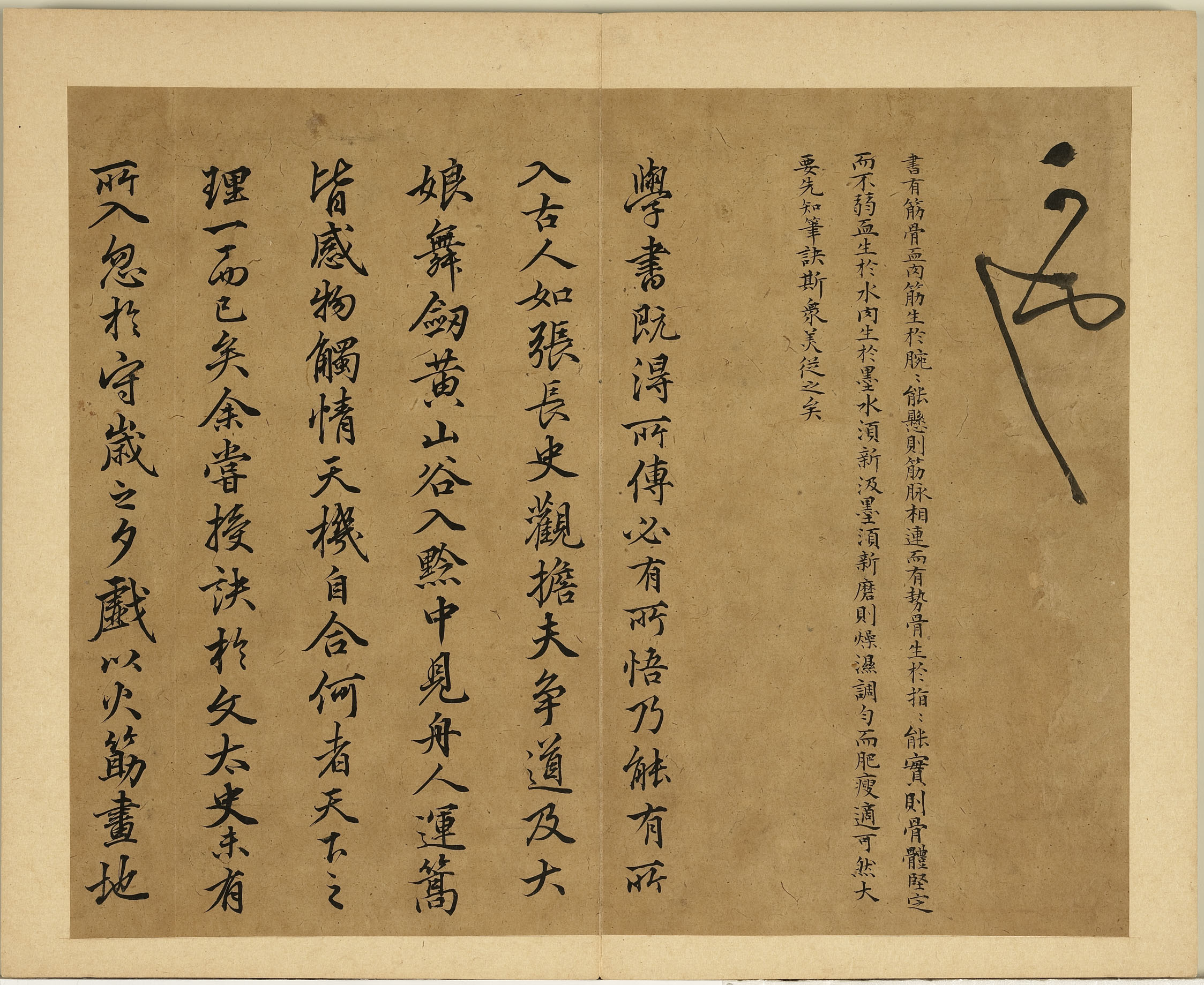 可也。(草书)。书有筋骨血肉。筋生於腕。腕能悬。则筋脉相连而有势。骨生於指。指能实。则骨体坚定而不弱。血生於水。肉生於墨。水须新汲。墨须新磨。则燥湿调匀。而肥瘦适可。然大要先知笔诀。斯眾美从之矣。(楷书)。学书旣得所传。必有所悟。乃能有所入。古人如张长史观担夫争道。及大娘舞剑。黄山谷入黔中。见舟人运篙。皆感物触情。天机自合。何者。天下之理。一而已矣。余尝授诀於文太史。未有所入。忽於守岁之夕。戏以火筯画地