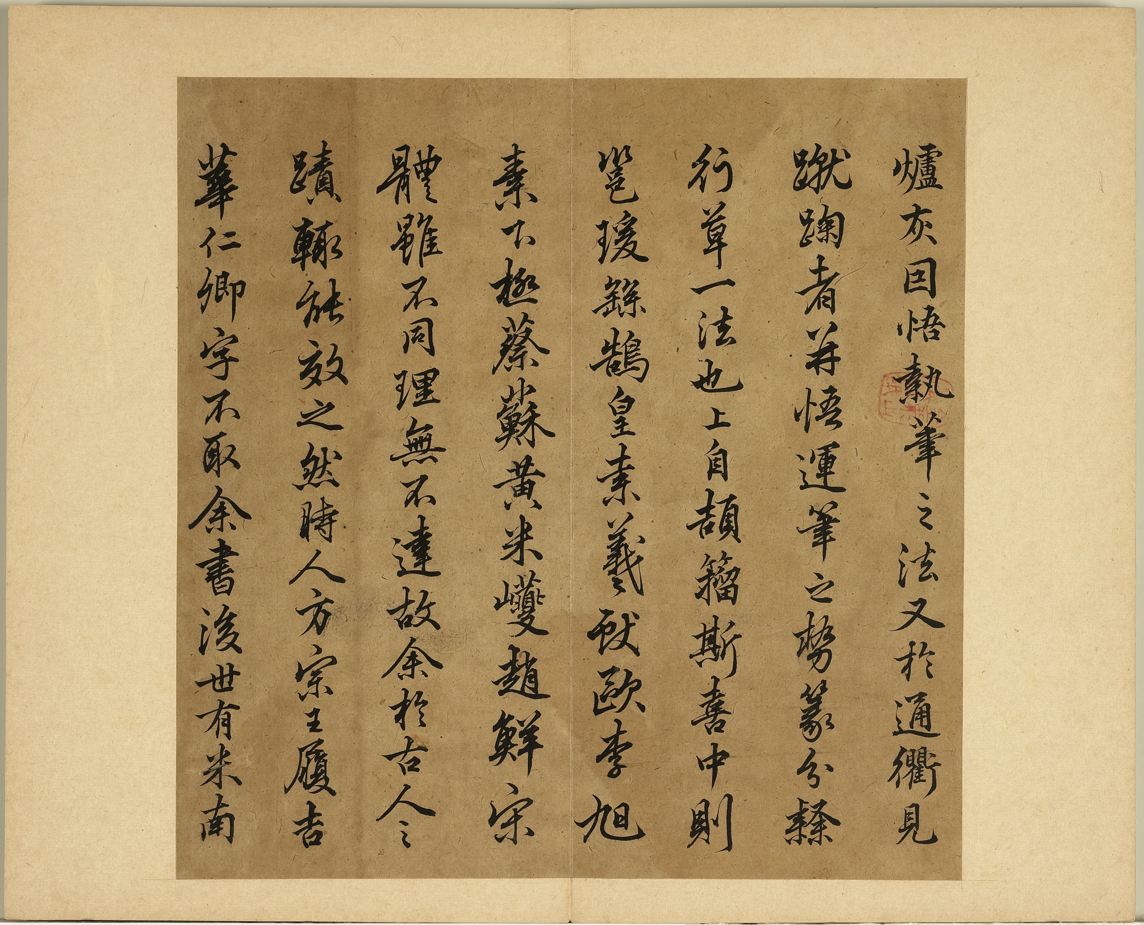 角也。违而不犯。和而不同。带燥方润。将浓遂枯。则如壁拆。言布置有自然之巧也。指实臂悬。笔有全力。擫衂顿挫。书必入木。则如印印泥。言方圆深厚而不轻浮也。点必隐锋。波必三折。肘下风生。起止无迹。则如锥画沙。言劲利峻拔而不凝滞也。姜尧章虽著此语。而未究其义。盖亦千古之祕耳。(行书)。