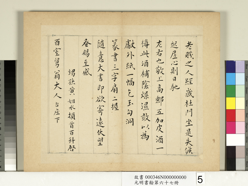 释文:老賤之人。經歲杜門。坐是失候起居。心則日馳左右也。敬上高郵五加皮酒一樽。此酒補陰燥濕。敢以為獻。外紙一幅。乞玉勾洞。篆書三字扇二握。隨意大書。卽欲寄遠。伏望蚤賜。至感。 款署:甥孫黃姬水頓首百拜啟。酉室舅翁大人台座下。