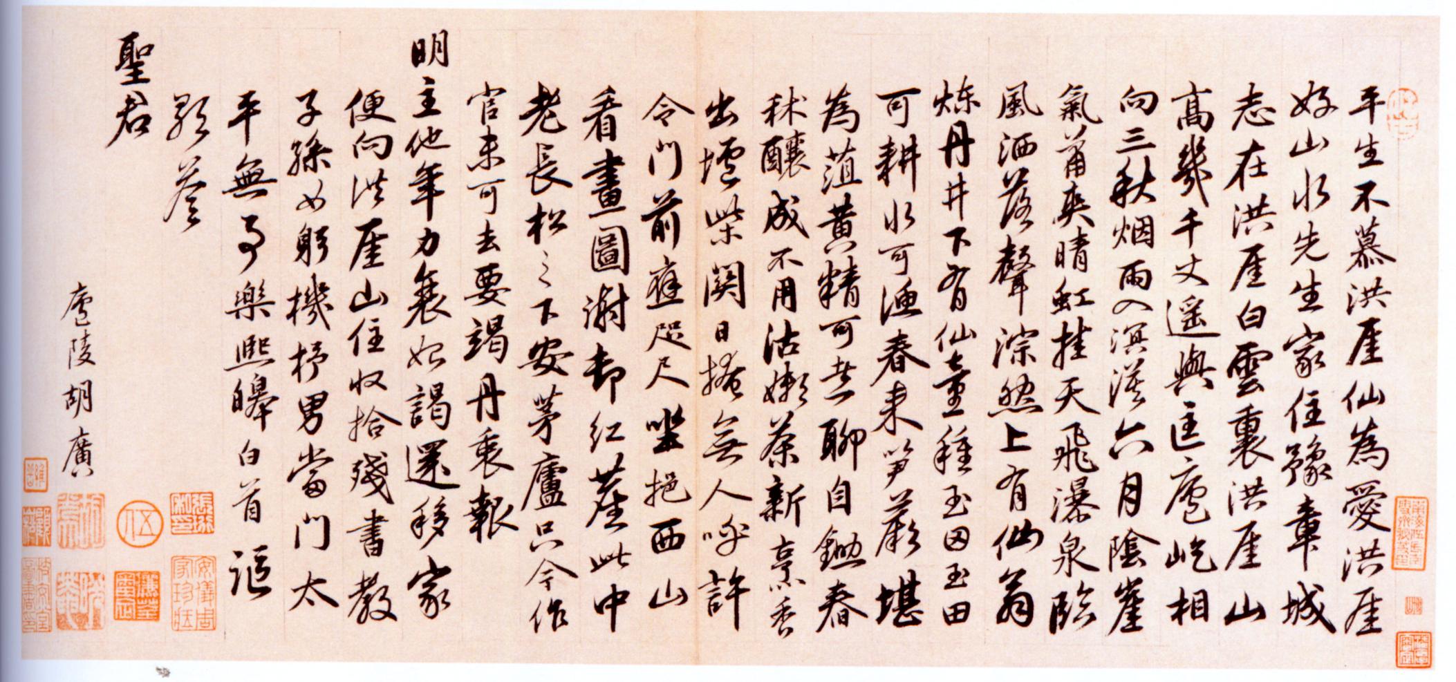 款署“庐陵胡广”。钤“胡光大”、“晄菴”、“好古”印。鉴藏印有“安仪周家珍藏”、“潘厚审定”、“南海伍氏南叟秘笈印”、“顾崧”、“张珩私印”等共计10方。