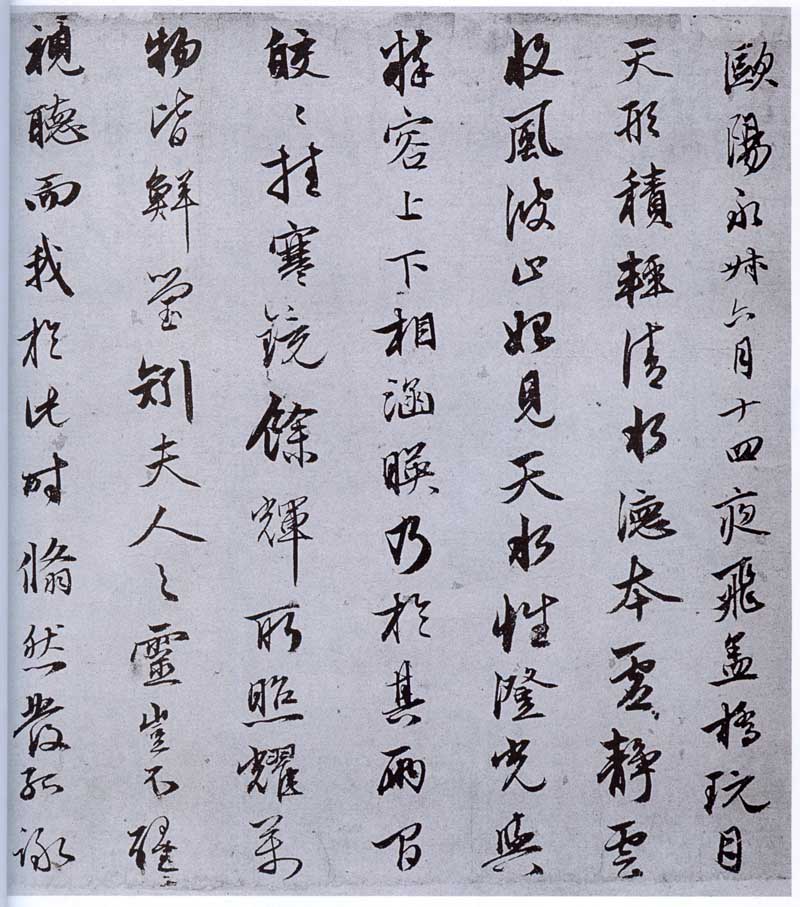 【释文】歐陽永权六月十四夜飛蓋橋玩月天形積輕清,水德本虛靜。雲收風波止,始見天水性。澄光與粹容,上下相涵暎。乃於其兩間,皎皎掛寒鏡。餘輝所照耀,萬物皆鮮瑩。矧夫人之靈,豈不醒視聽。而我於此時,翛然發孤詠。紛昏忻洗滌,俯仰恣涵泳。人心曠而閑,月色高愈迥。惟恐清夜闌,時時瞻斗柄。
