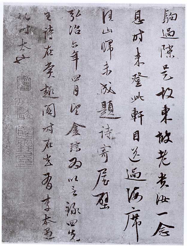 弘治六年,金琮四十四岁,正值盛年。这年四月,几个诗友聚会赏趣阁,应以言之请,金琮书四先生诗。此处节录的是欧阳修的《六月十四夜飞盖桥玩月》及苏軾的《瞻息轩》两首。这两人都是宋代著名的文学家,欧诗抒写的是水光与月光相互辉映而產生的联想,认為「人心旷而闲」,纔能体会万物之性,见『万物皆鲜莹』之景,苏诗讲静坐养性的重要,认為人生如白驹过隙,静坐无欲,生命得以延长。欧、苏的这种人生体验,正是远离世俗和烦恼的文人所追求的境界。金琮不屑仕途,过的就是遐啸清视,读书明道的悠閒生活。