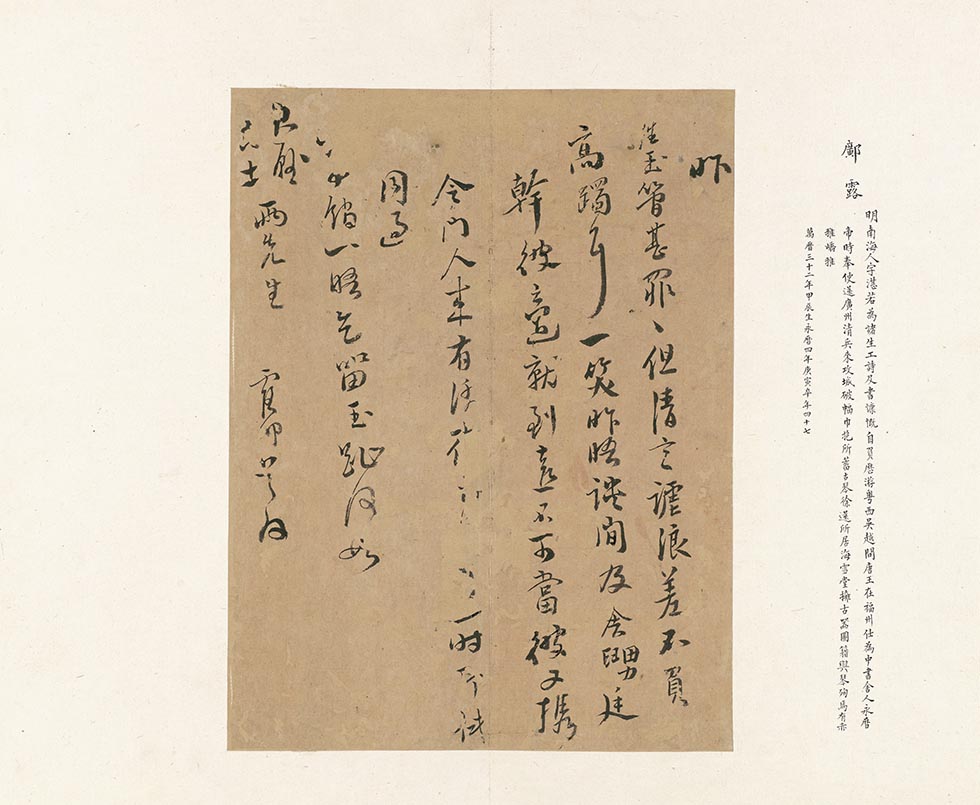 邝露《行书手札》纸本行书 27.8 × 21.1cm 普林斯顿大学美术馆 藏 释文: 昨往玉管甚罪罪,但请言谑浪,差不负高躅耳,一笑。昨唔谈间及舍舅廷干,彼适就到,喜不可当,彼又携令门人来,有□□□□□□一时即□同过□□馆一唔,乞留玉趾,何如?□□、□□两先生。露叩首拜。