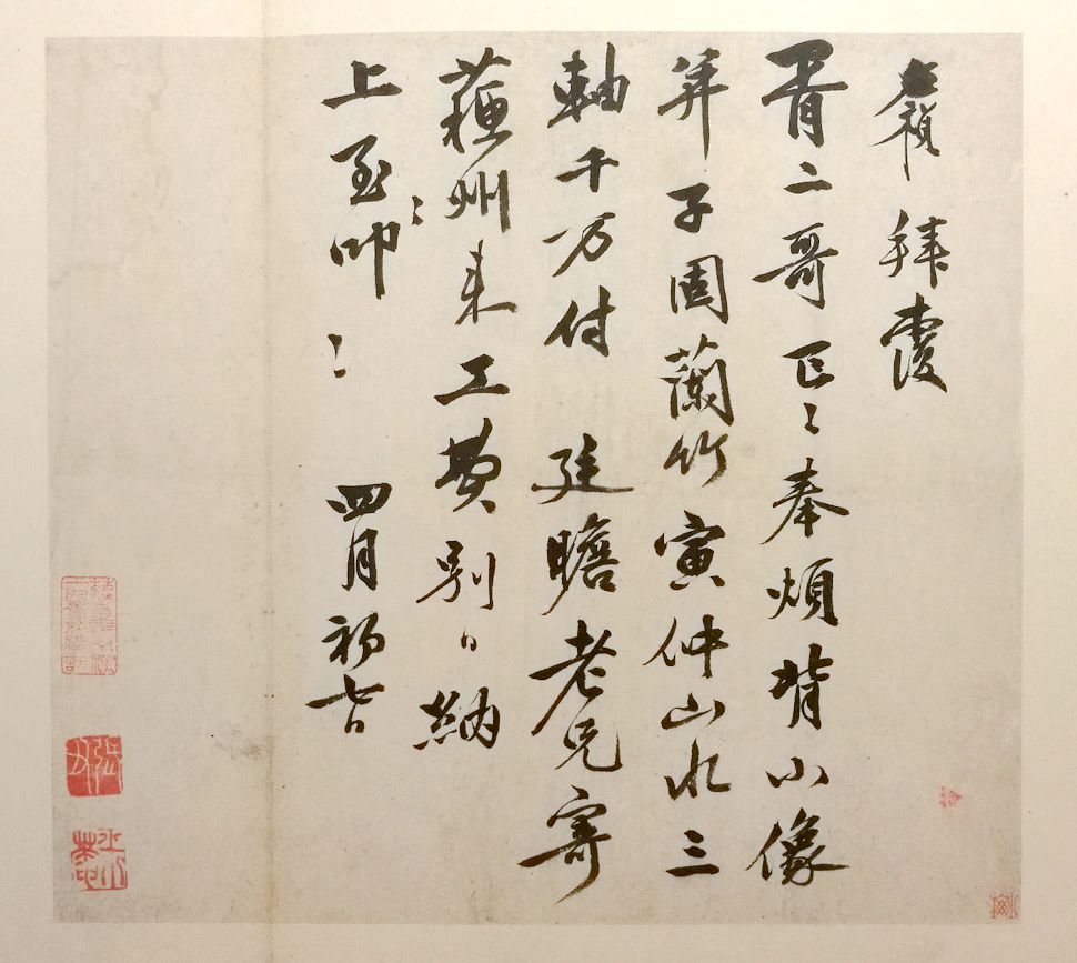 释文:應禎拜覆胥二哥。區區奉煩背小像并子固蘭竹、寅仲山水三軸,千萬付廷瞻老兄寄蘇州來,工費別日納上。至叩至叩。四月初七日。