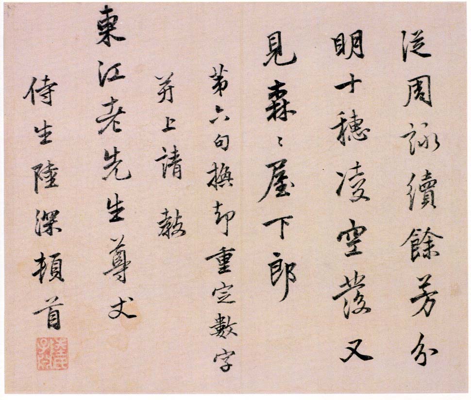 释文:芣苢诗 大芥生花过泮墙,容台芣苢入帘长。 即看事业归调鼎,剩有文章起故乡。 并作佳谈传两地,拟从周咏续馀芳。 分明十穗凌空发,又见森森屋下郎。 第六句换却重定数字,并上请教东江老先生尊丈。侍生陆深顿首。 钤印:陆氏子渊(白文)