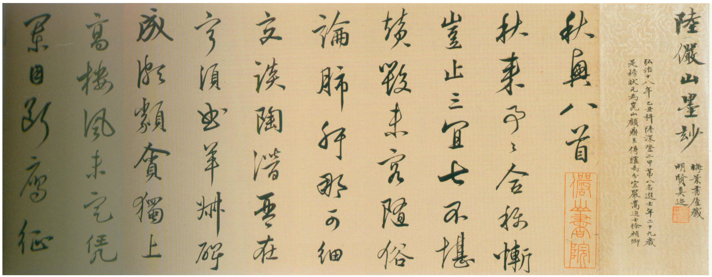 餘种之多,有明代文苑祭酒之称。本卷效仿唐代诗圣杜甫《秋兴》八首而自著七律八章,