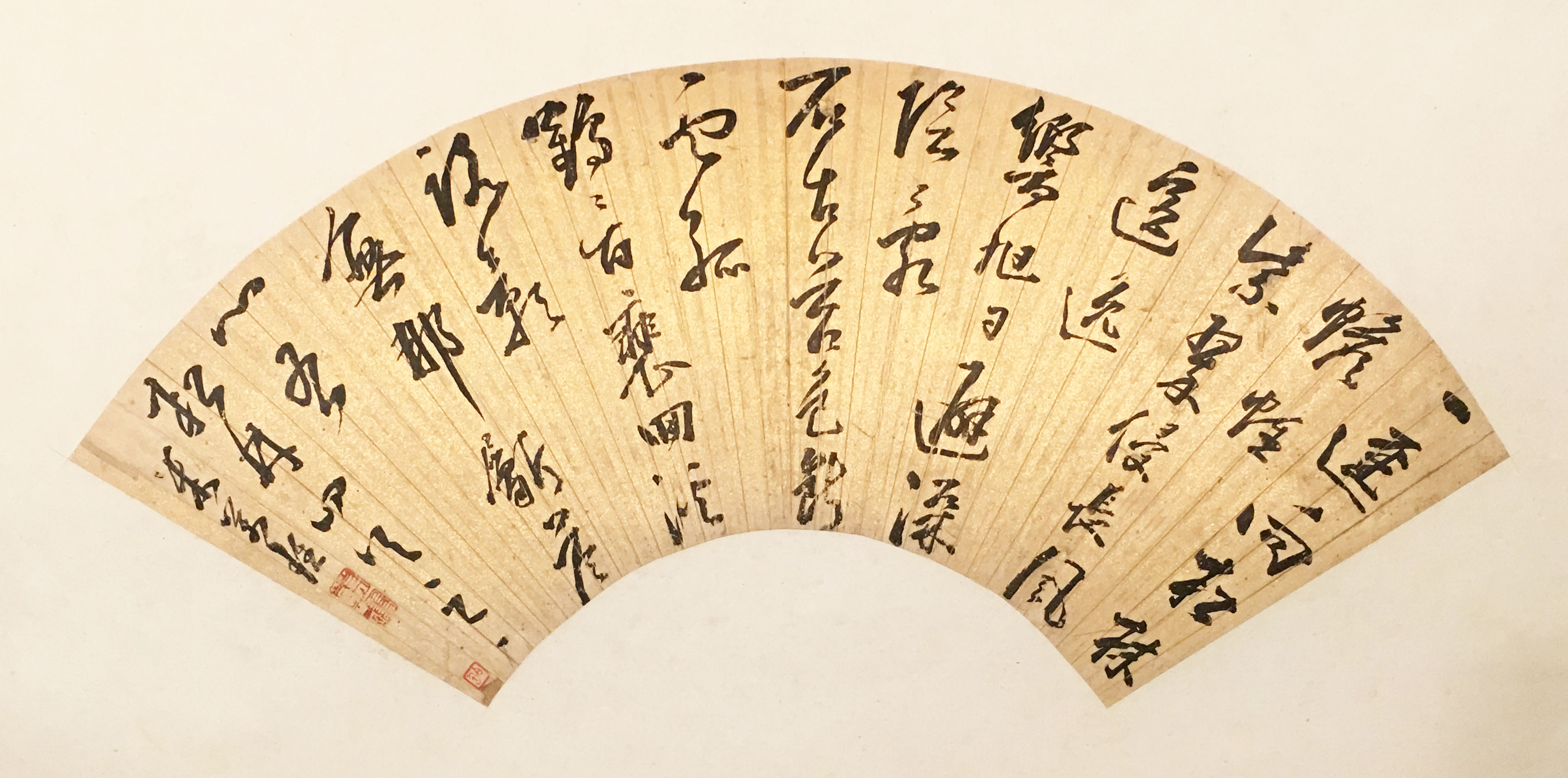 米万锺《行书松林四首之一扇页》纸本金笺行书 16.5×50.6cm 南京博物院藏 释文:一径向松林,幨帷紫翠侵。长风遥逸响,旭日避深阴。乱石古苔色,断云孤鹤鹤。百裴回溪路,影无那斸答(心)。右松林四首之一。米万锺。