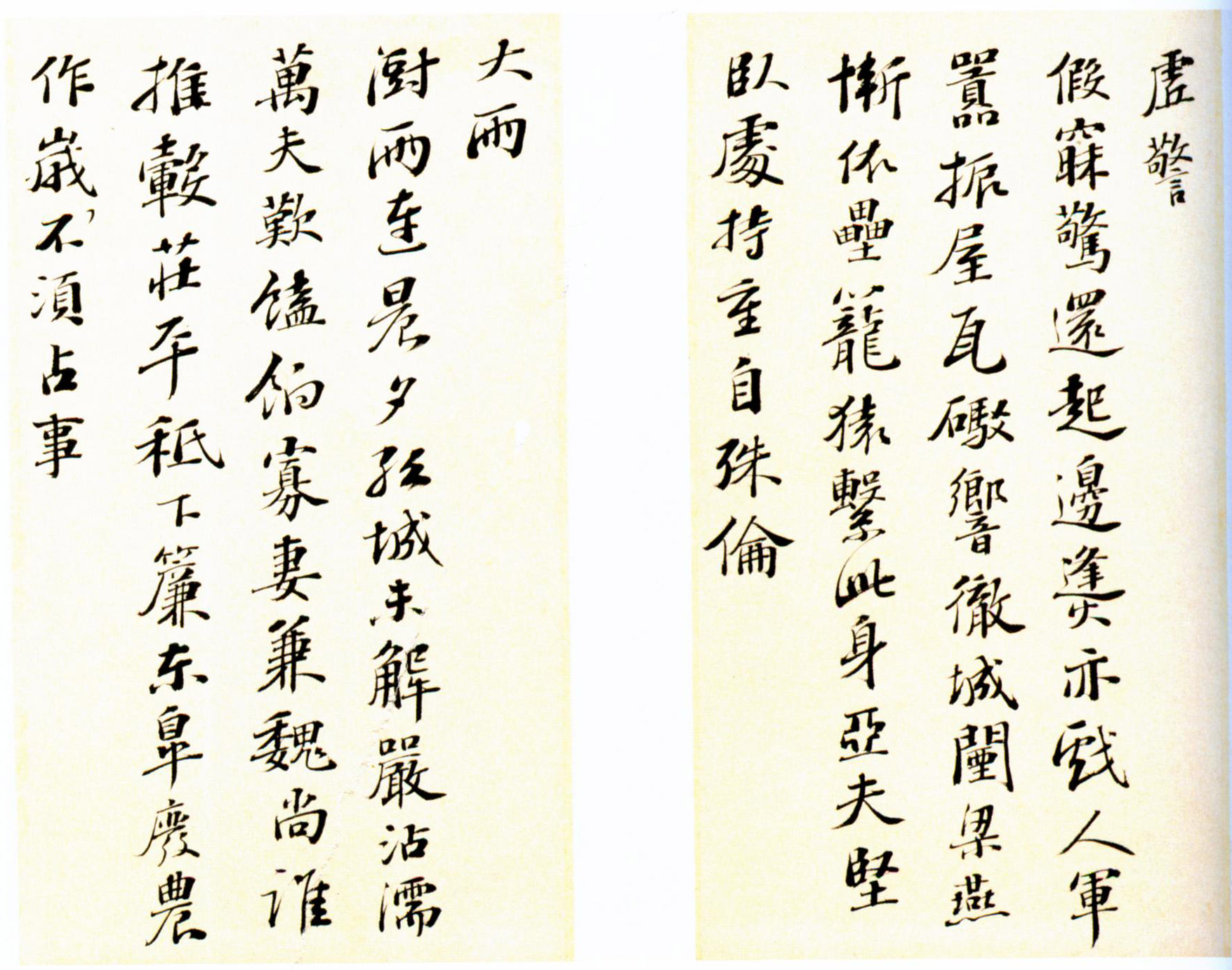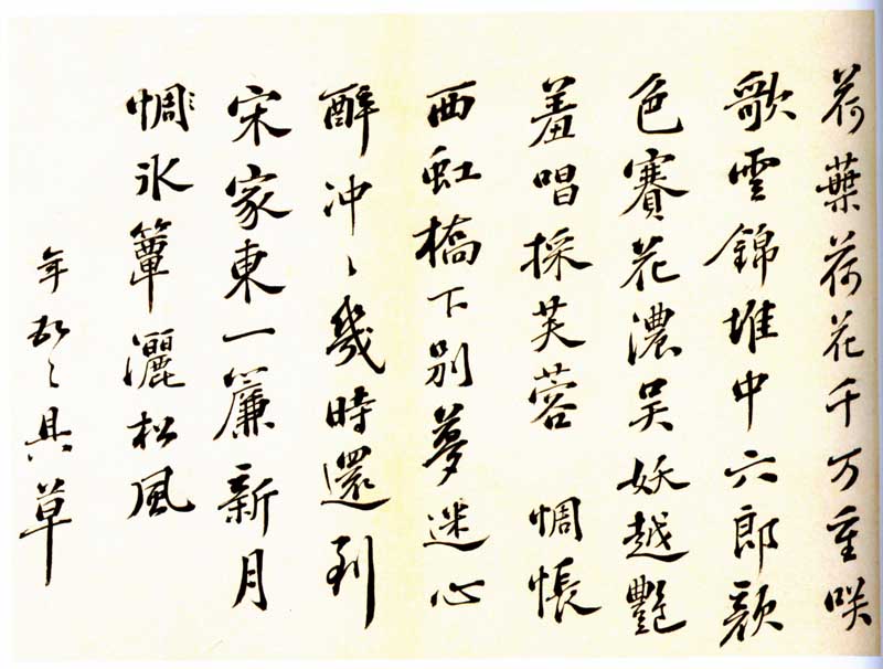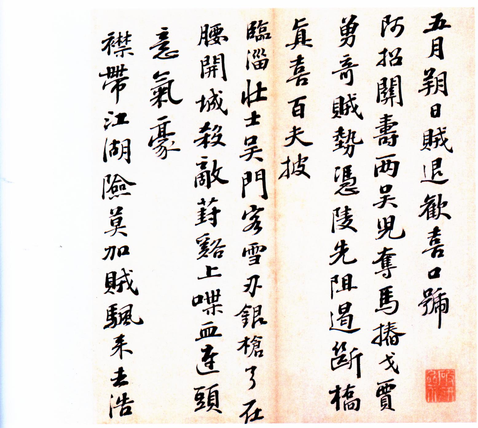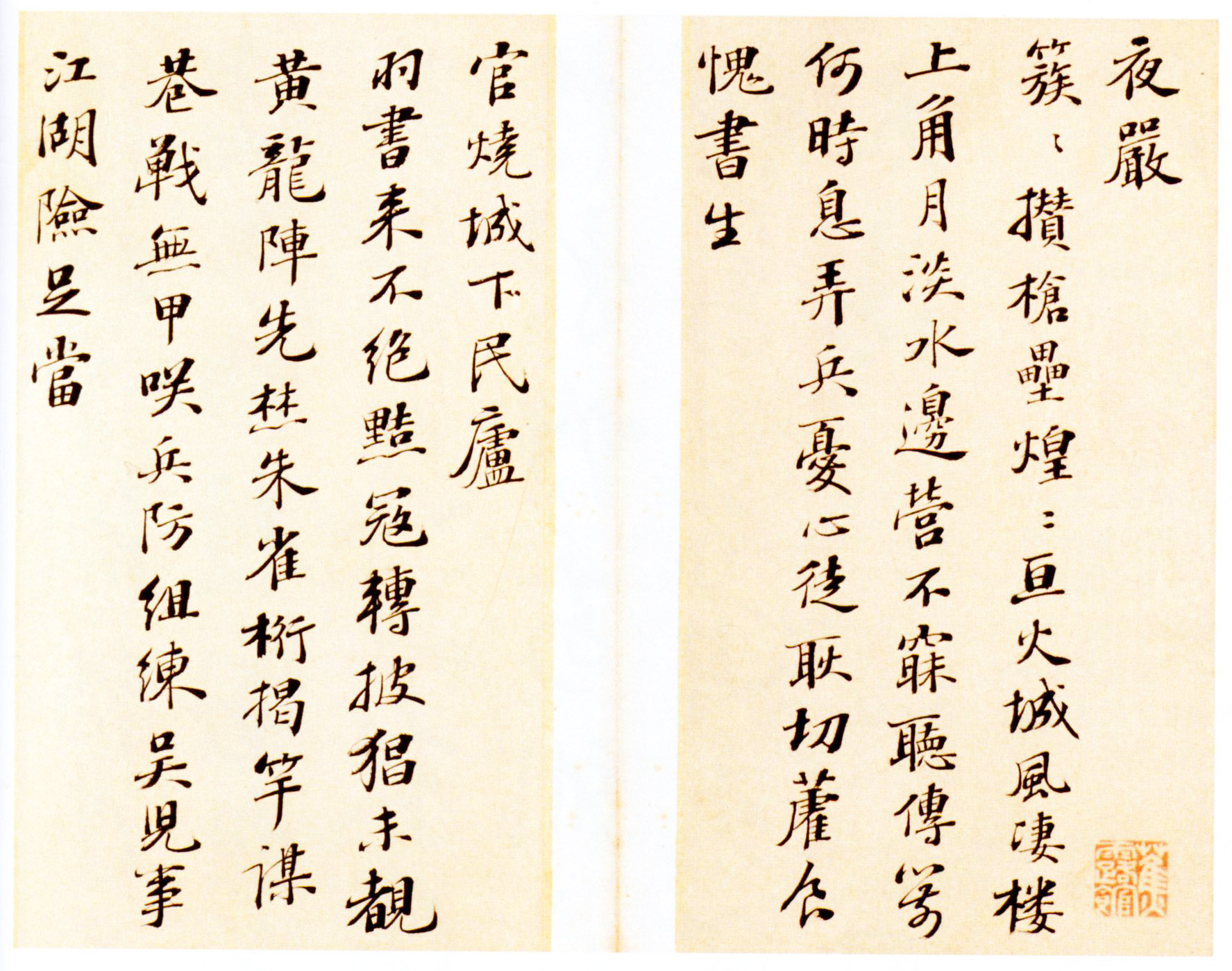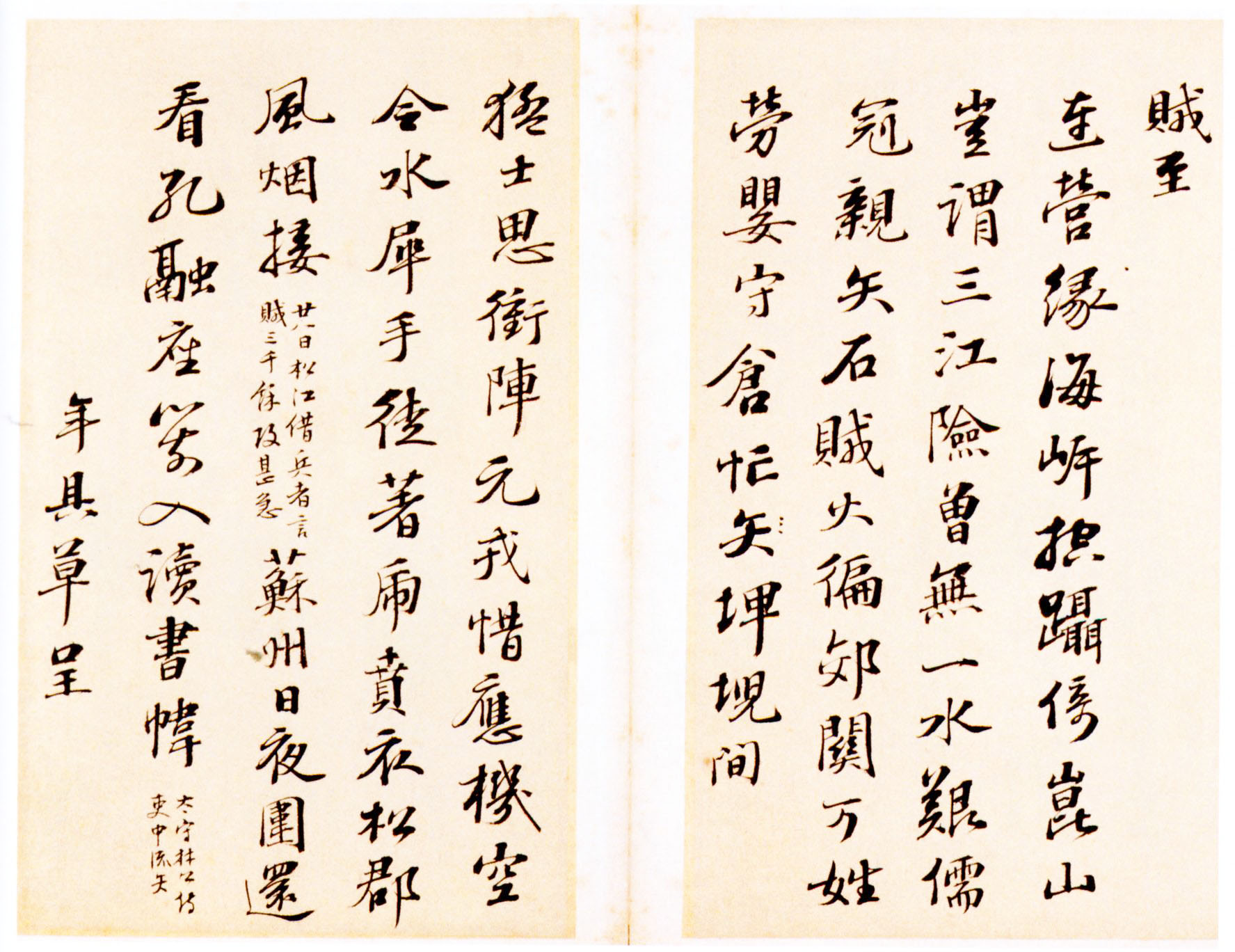 【释文】送古石符卿还朝。符台清贵美英僚,奉节遥乘使者轺。星象久虚青琐籍,天颜行近紫宸朝。徐陵不独文才妙,张敞兼称武略超。归报幸敷前席对,海瀕夷祲未全消。 江皋腊近早舒梅,晴色如春暖律开。北客留连光祖席,南枝攀折荐离杯。风烟未恋鸥波阔,霄汉方啣凤诏回。报王匡时须俊杰,知君元抱出群才。年具草呈。 五月朔日贼退欢喜口号。阿招关寿两吴儿,夺马摏戈贾勇奇。贼势凭陵先阻遏,断桥真喜百夫披。 临淄壮士吴门客,雪刃银枪弓在腰。开城杀敌葑溪上,喋血连头意气豪。 襟带江湖险莫加,贼颿来去浩无遮。休论馆谷余三宿,且返奔亡亿万家。 祵载如山下海鰌,夜乘风雨恣夷犹。邀归已失焚舟计,善后须劳食肉谋。 曾闻强努指潮低,况复江南箭满溪。何惜三千教迹射,折衝尊俎靖鯨鯢。年顿首呈。 夜严。簇簇攒枪垒,煌煌亘火城。风凄楼上角,月淡水边营。不寐听传箭,何时息弄兵。忧心徒耿切,藿食愧书生。 官烧城下民庐。羽书来不绝,黠寇转披猖。未睹黄龙阵,先焚朱雀桁。揭竿谋巷战,无甲笑兵防。组练吴儿事,江湖险足当。 虚警。假寐惊还起,边烽亦戏人。军嚣振屋瓦,礮响彻城闉。梁燕惭依垒,笼猿系此身。亚夫坚卧处,持重自殊伦。 大雨。澍雨连晨夕,孤城未解严。沾濡万夫叹,馌饷寡妻兼。魏尚谁推毂,庄平秪下帘。东皋废农作,岁不须占事。 贼至。连营缘海岸,控蹑倚崑山。岂谓三江险,曾无一水艰。儒冠亲矢石,贼火遍郊关。万姓劳婴守,仓忙(矢)埤堄间。 猛士思冲阵,元戎惜应机。空令水犀手,徒著虎贲衣。松郡风烟接(廿八日松江借兵者言,贼三千余攻甚急),苏州日夜围。还看孔融座,箭入读书帏(太守林公侍吏中流矢)。年具草呈。 荷叶荷花千万重,笑歌云锦堆中。六郎颜色赛花浓,吴妖越艳,羞唱采芙蓉。 惆怅西虹桥下别,梦迷心醉冲冲。几时还到宋家东,一帘新月(惆),冰簟洒松风。年顿首具草。