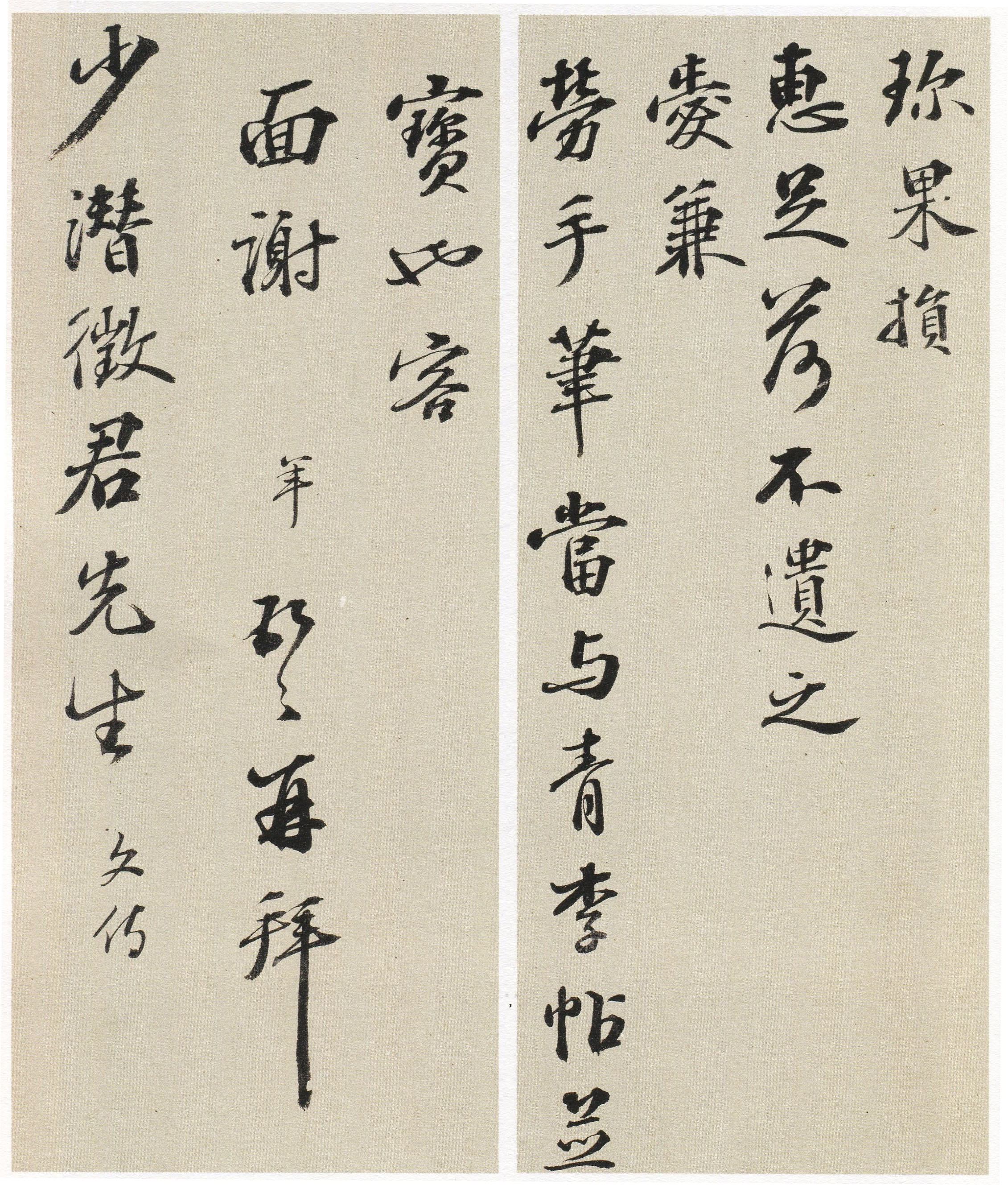 释文:珍果損惠,足荷不遺之愛。兼勞手筆,當與《青李帖》並寳也。容面謝。年頓首再拜。少潛徵君先生文侍。