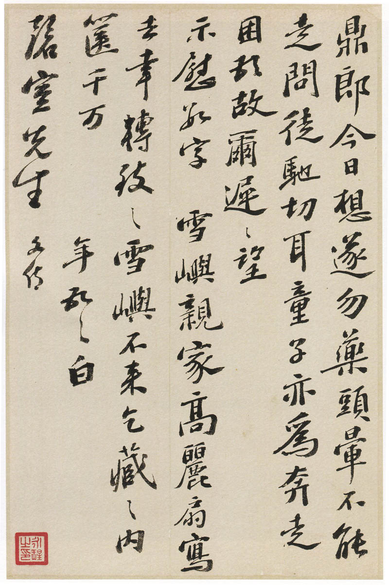 释文:鼎郎今日想遂勿藥,頭暈不能走問,徒馳切耳。童子亦為奔走困頓,故而遲遲,望示慰數字。雪嶼親家高麗扇寫去,幸轉致之。雪嶼不來,乞藏之內篋,千萬。年頓首白。磬室先生文侍。