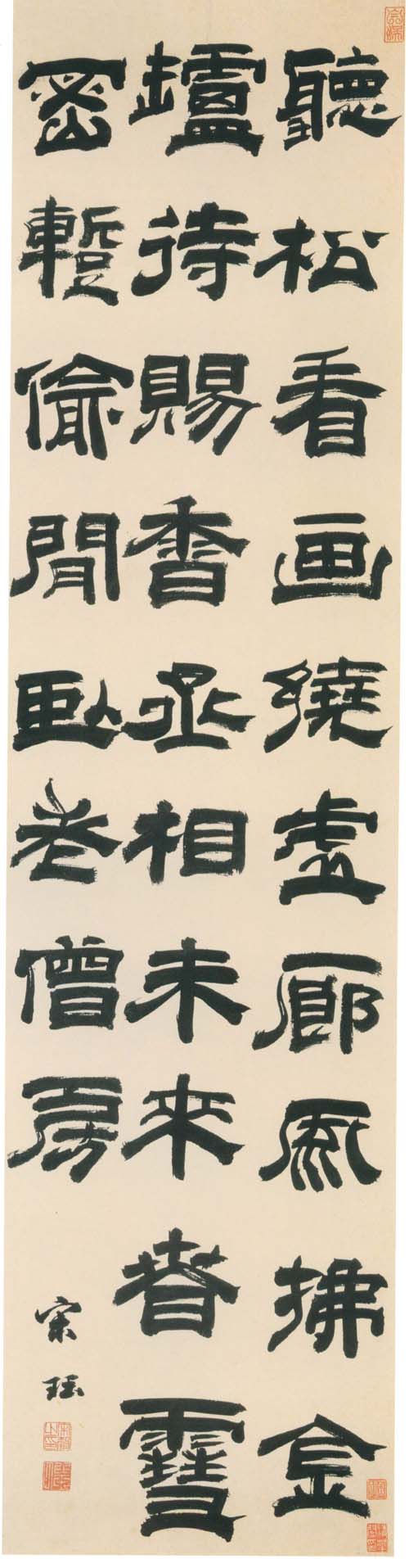 宋珏《隶书郑谷定水寺行香诗轴》纸本隶书 122.5×30.7cm 南京博物院藏 释文:听经看画绕虚廊,风拂金炉待赐香。 丞相未来春雪密,暂偷闲卧老僧床。宋珏。