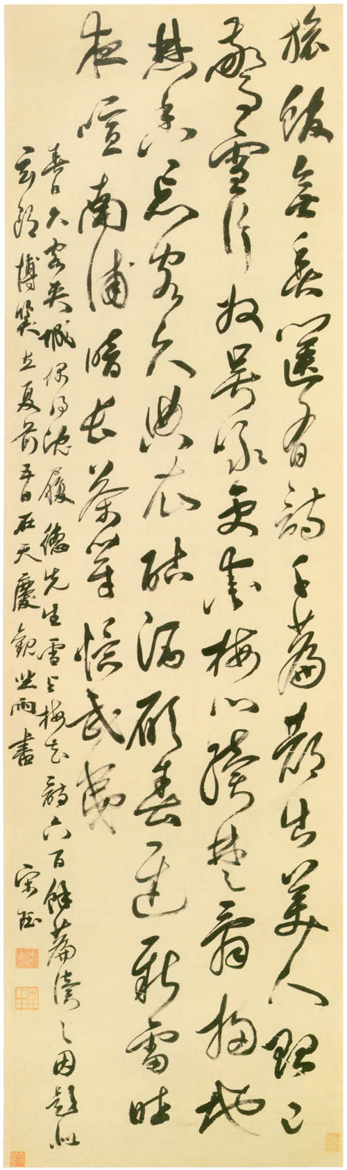 释文:旅馆无鱼筐有诗,千篇都出美人貽。已惊雪片收吴咏,更爱梅心绩楚辞。扫地焚香忘客 久,典衣酤酒愿春迟。新雷昨夜喧南浦,暗长茶芽忆武夷。 款署:春日久客吴城,偶得沈履德先生 雪片梅花诗六百餘篇,读之因题,似玄朗博笑。立夏前五日,在天庆观坐雨书。宋玨。 此书痛快淋漓,一气呵成,大小字错落呼应,浑然一体,更具韵律和谐之美。 【资料来源】《中国法书全集》-15-明-4(文物出版社)