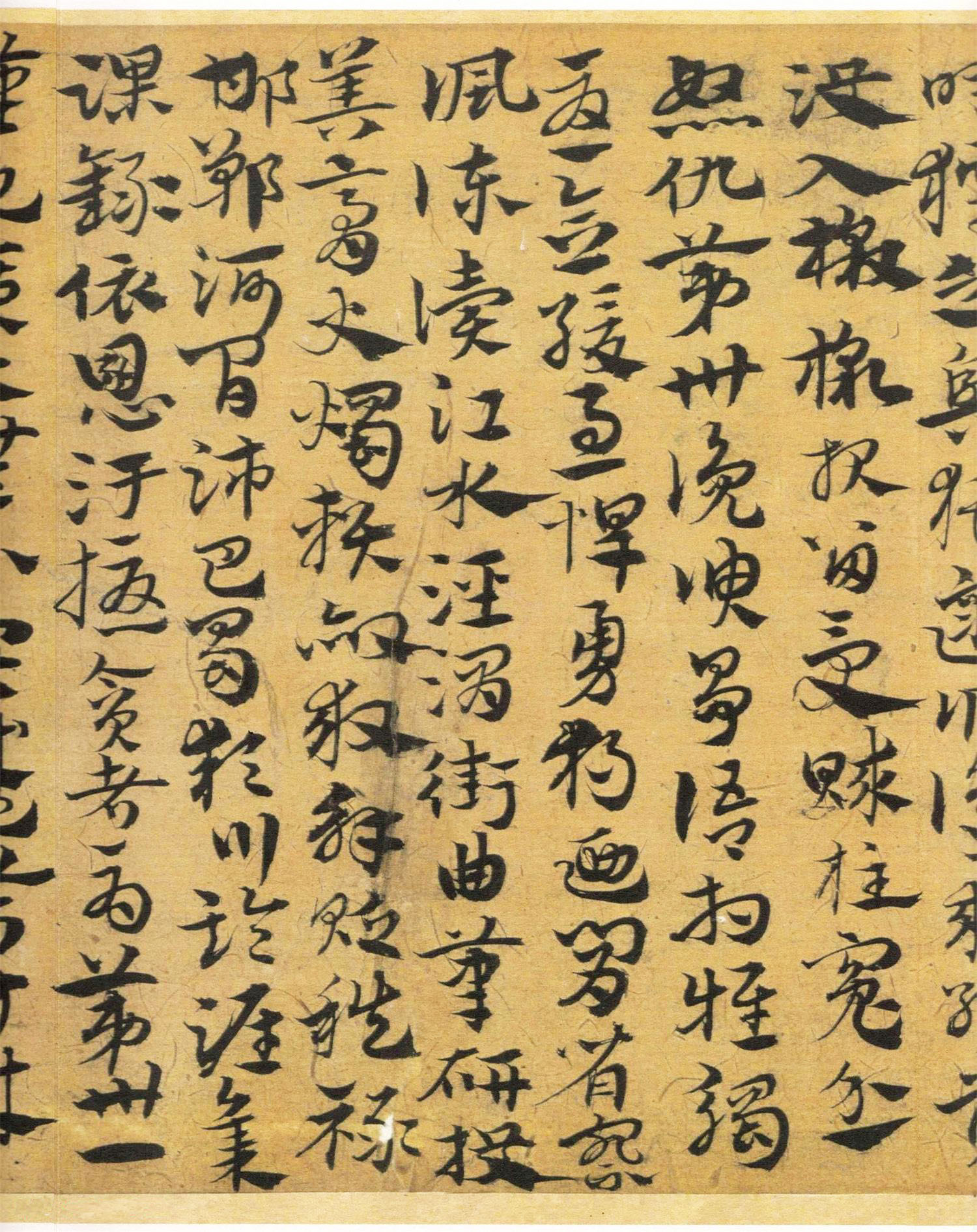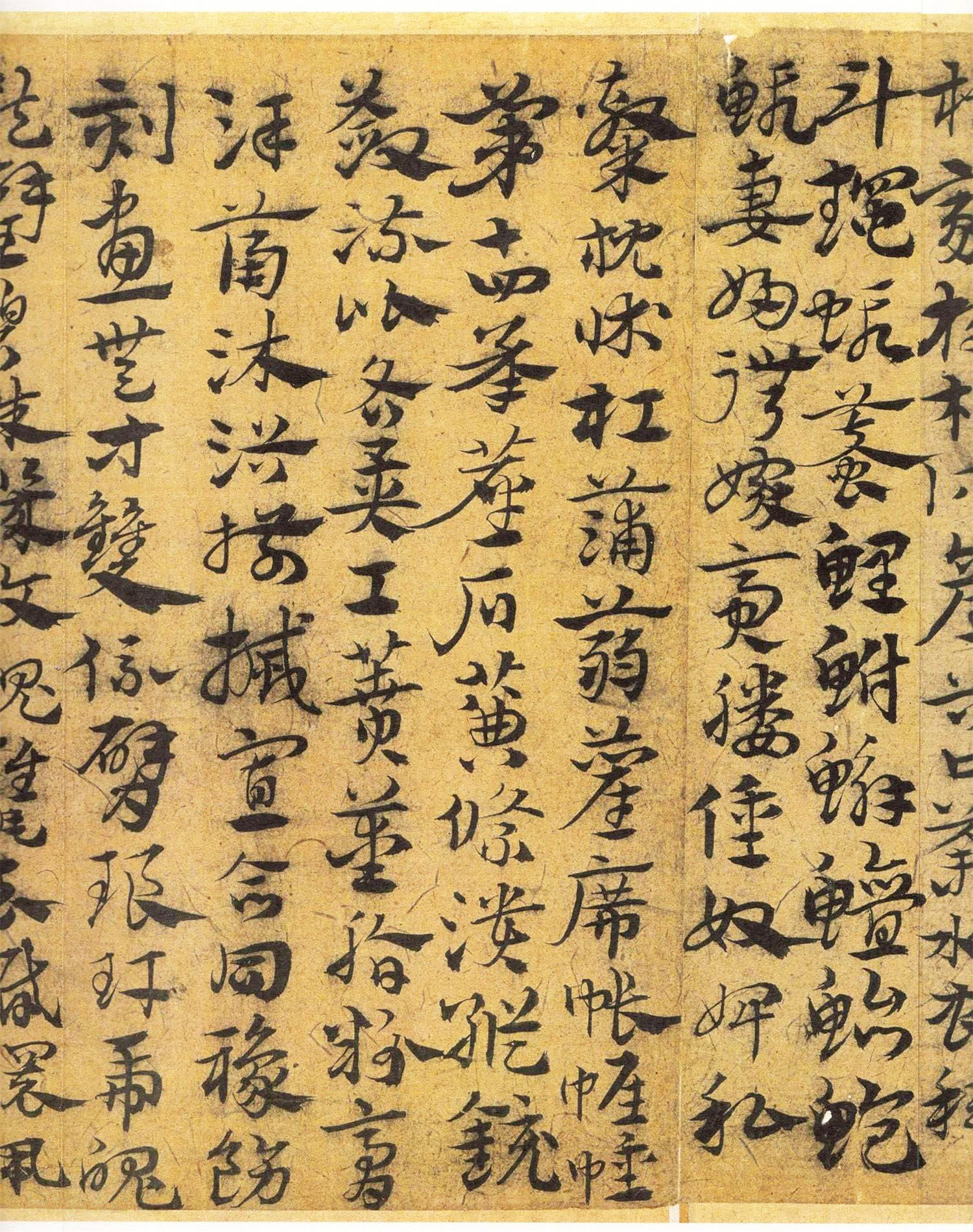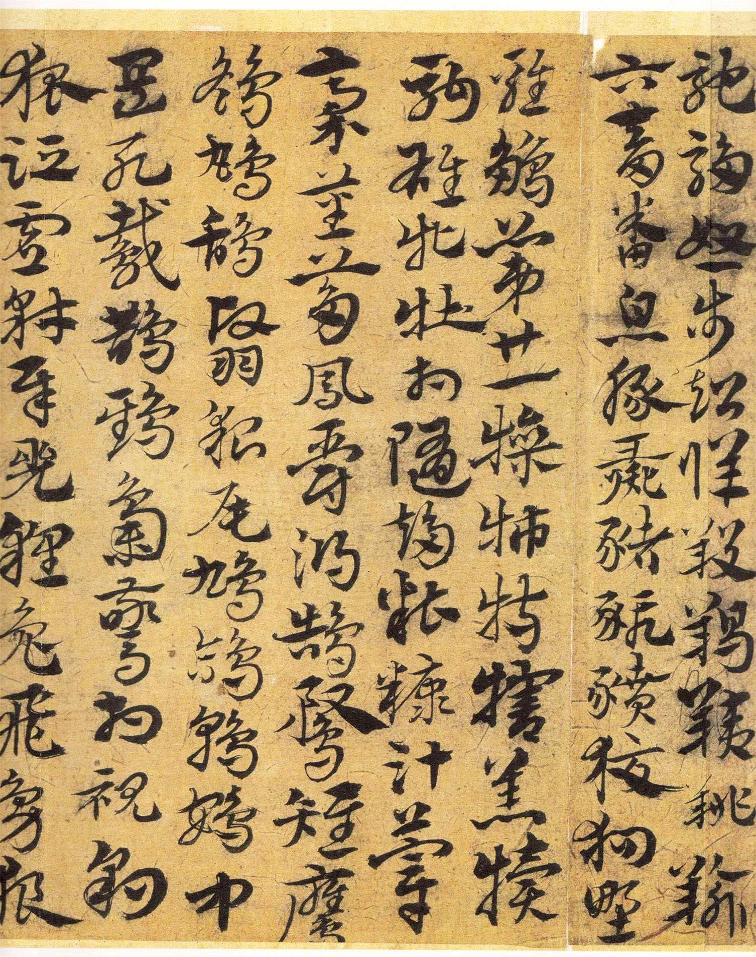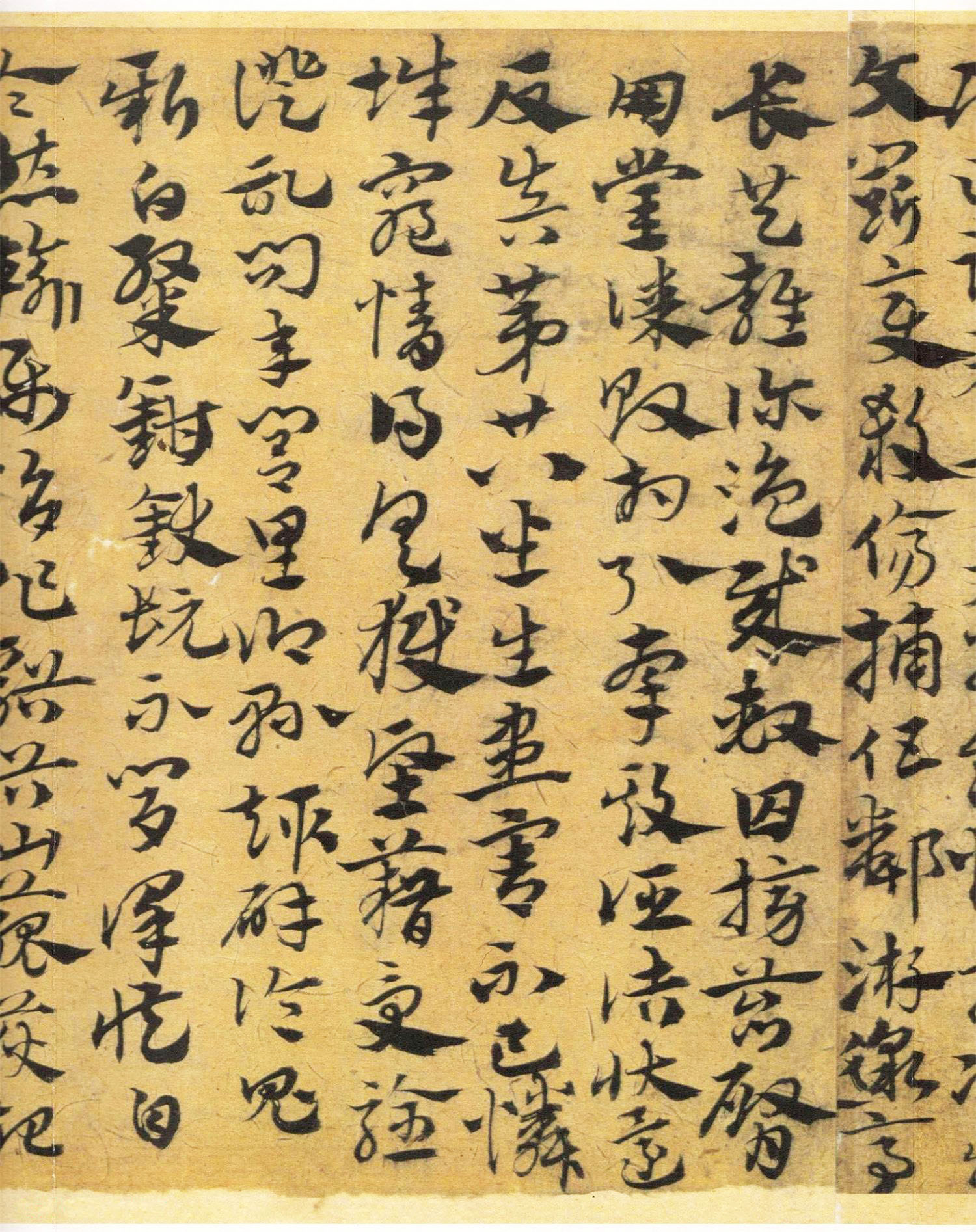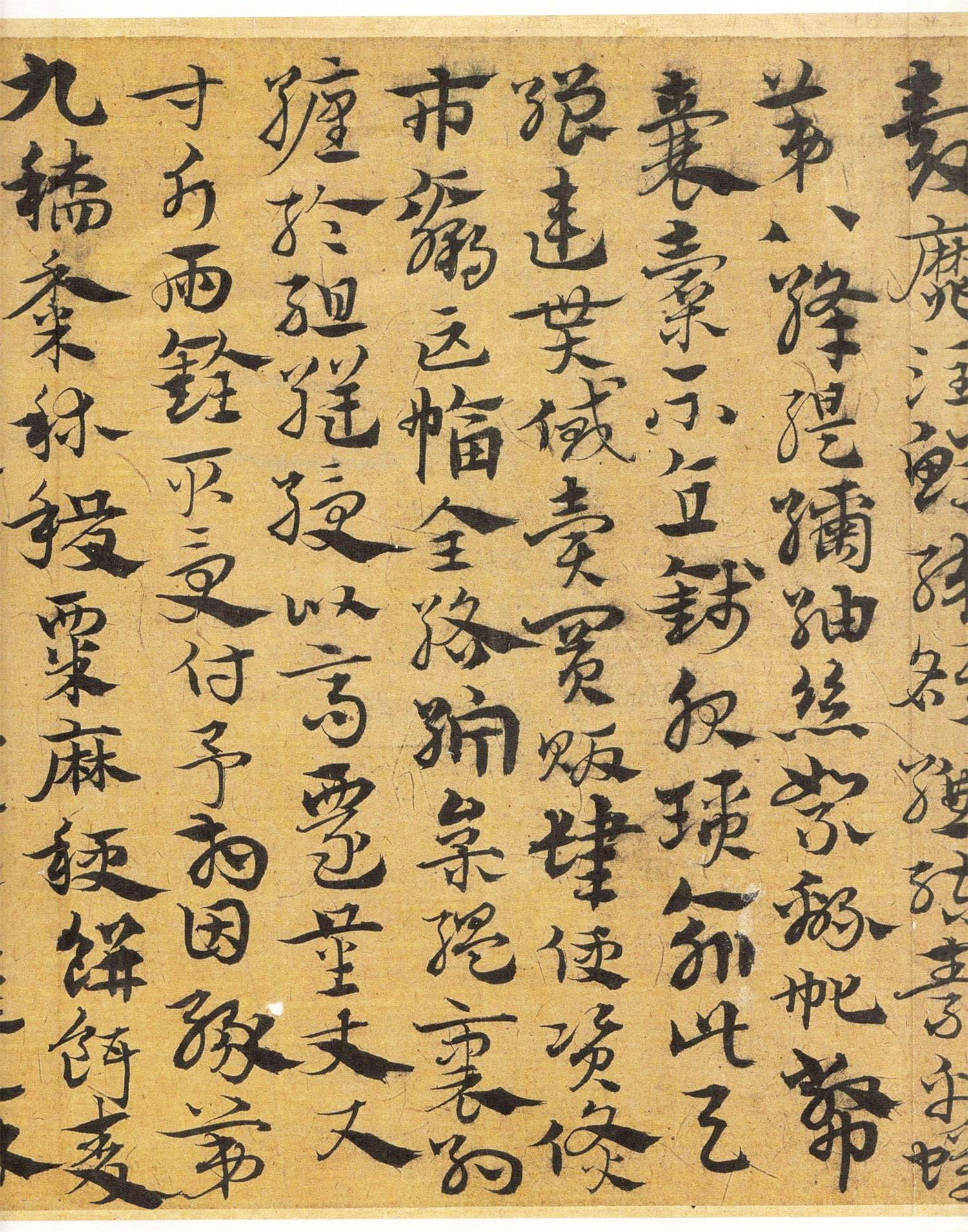 与北京故宫本相比,此作更为老辣,趋于对“古质”的汲取。字间茂密,字形变长方为扁方,多显隶意,与皇象的《急就章》又“貌合神离”,其用笔流畅,行、草相杂,结构多变,笔意健峭,古雅微存。粗犷的波脚与瘦劲的笔画巧妙结合,相映成趣,显得更为生动精采,富有感染力,又具有今草的灵性、跌宕的艺术情趣。在“今妍”中透露二王笔意。王世贞《艺苑卮言》称宋克“章草是当家,健笔纵横,差少含蓄”,或许正能表达此类作品特征,此少“含蓄”是相对“古质”而言,这种临写方法打破了整幅全以章草波挑表示“隶意”的方法,参以行草之法,将章草艺术推向了新的高峰,这是章草发展到宋、元以后而形成的新风格,可谓高古雅致。