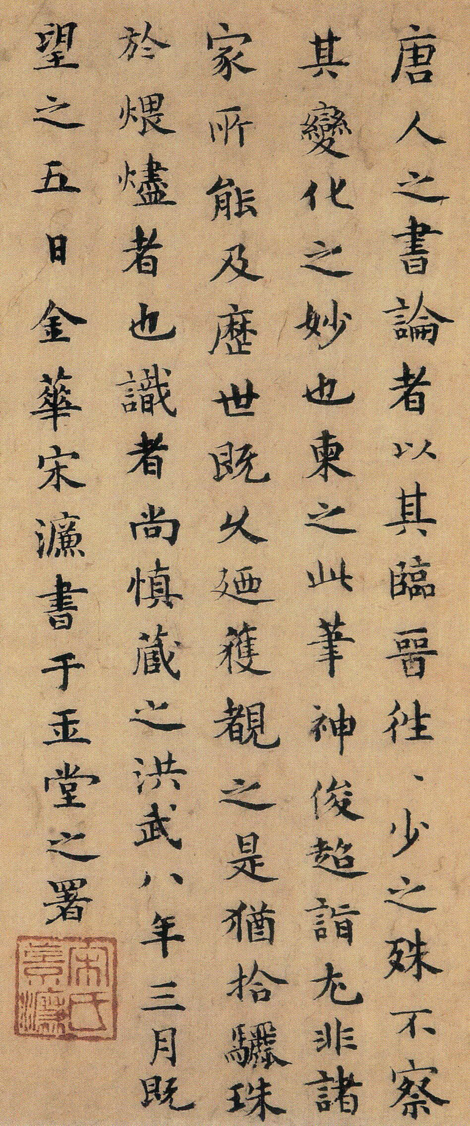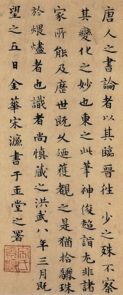 释文: 唐人之書。論者以其臨晉。往往少之。殊不察其變化之妙也。柬之此筆。神俊超詣。尤非諸家所能及。歷世既久。迺獲覩之。是猶拾驪珠於煨燼者也。識者尚慎藏之。洪武八年(公元1375年)三月既望之五日。金華宋濂書於玉堂之署。