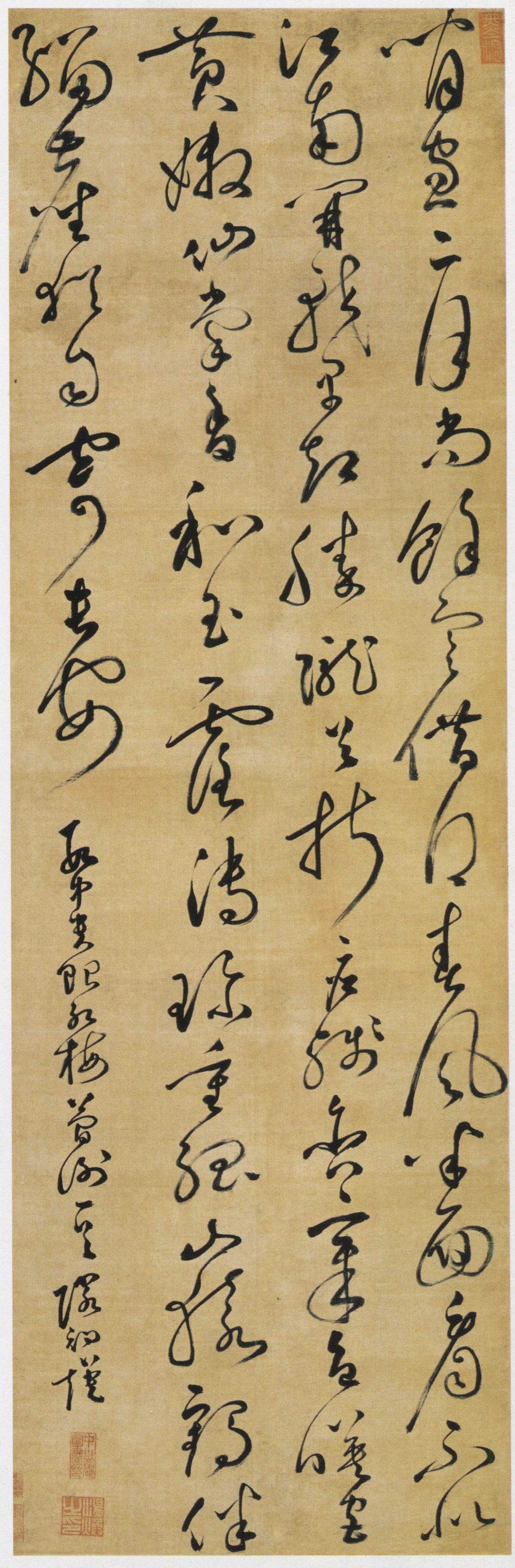 汤焕《草书段中贵贻红梅简谢诗轴》 163.4×52.8cm 浙江省博物馆藏 释文:闲窗二月尚馀寒,借得春风半面看。不似江南 开战早,期胜陇首折应残。含章色暮宫黄嫩,仙掌香和玉 露传。珍重孤山猿鹤伴,缁尘犹白寄长安 款署:段中贵贻红梅简谢一首,邻初焕。 钤印:墨池(朱文引首)、汤焕之印(白文) 鉴赏印:中山郡图书印(白文)、海昌钱镜塘珍藏乡贤遗迹记(朱文)等 【资料来源】《翰墨清芬》——浙江省博物馆典藏大系(浙江古籍出版社)