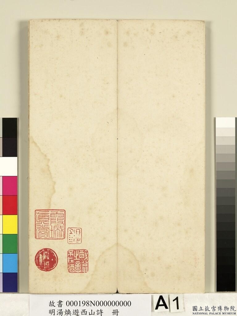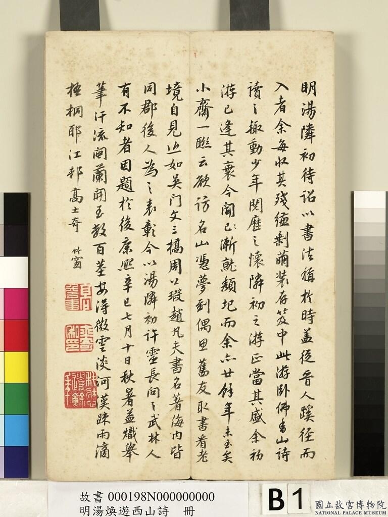 题跋:明湯隣初待詔。以書法稱於時。蓋從晉人蹊徑而入者。余每收其殘縑剩繭。裝存笈中。此游臥佛香山詩。讀之輙動少年閱歷之懷。隣初之遊。正當其盛。余初游已逢其衰。今聞已(點去)漸就頹圮。而余亦廿餘年未至矣。小齋一聯云。欲訪名山憑夢到。偶思舊友取書看。老境自見。近如吳門文三橋。周公瑕。趙凡夫。書名著海內。皆同郡後人為之表彰。今以湯隣初許靈長問之武林人。有不知者。因題於後。康熙辛巳(西元一七0一年)七月十日。秋暑益熾。舉筆汗流。閩蘭開至數百莖。安得微雲淡河漢。踈雨滴梧桐耶。江邨高士奇。竹窗。