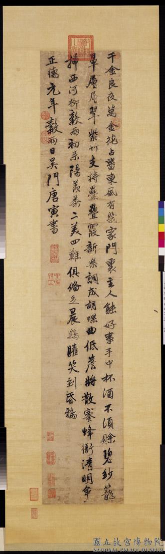 唐寅《“千金良夜”七言律诗轴》纸本行书 140×25.2cm 台北故宫博物院藏 释文:千金良夜萬金花。占盡東風有幾家。門裡主人能好事。手中杯酒不須賒。碧紗籠罩層層翠。紫竹支持疊疊霞。新樂調成蝴蝶曲。低簷將散蜜蜂衙。清明爭插西河柳。穀雨初來陽羨茶。二美四難俱備足。晨雞驩笑到昏鴉。正德元年(西元一五○六年)穀雨日。吳門唐寅書。