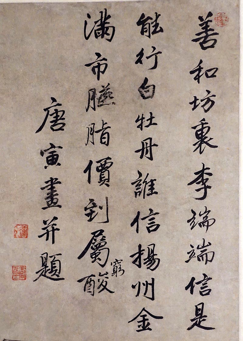 释文:善和坊里李端端,信是能行白牡丹,谁信扬州金满市,胭脂价到属穷酸。唐寅画并题。