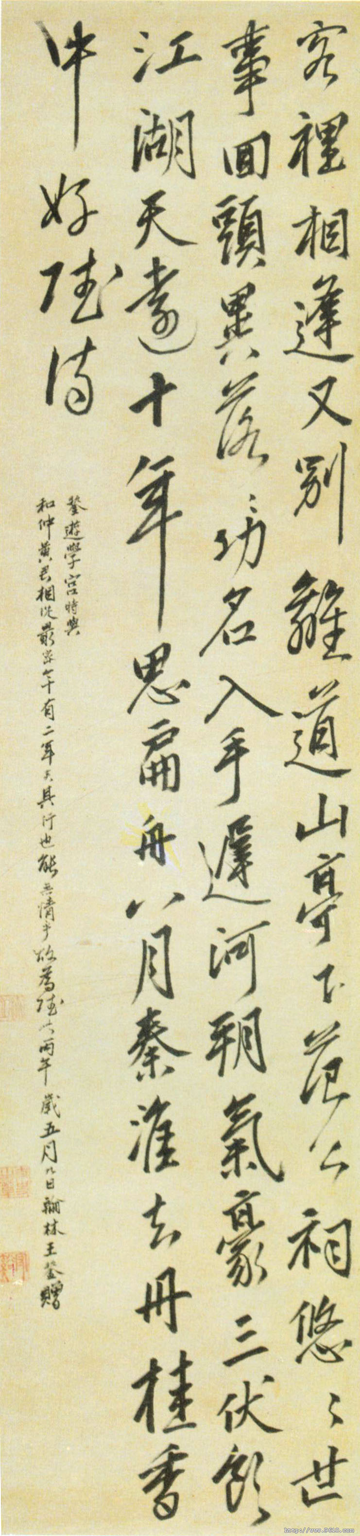 此诗是王鏊为送朋友出行分别时所作并书,时年37岁。其书清劲爽健,瘦硬挺拔,结字严谨修长,系细硬笔毫所为。
