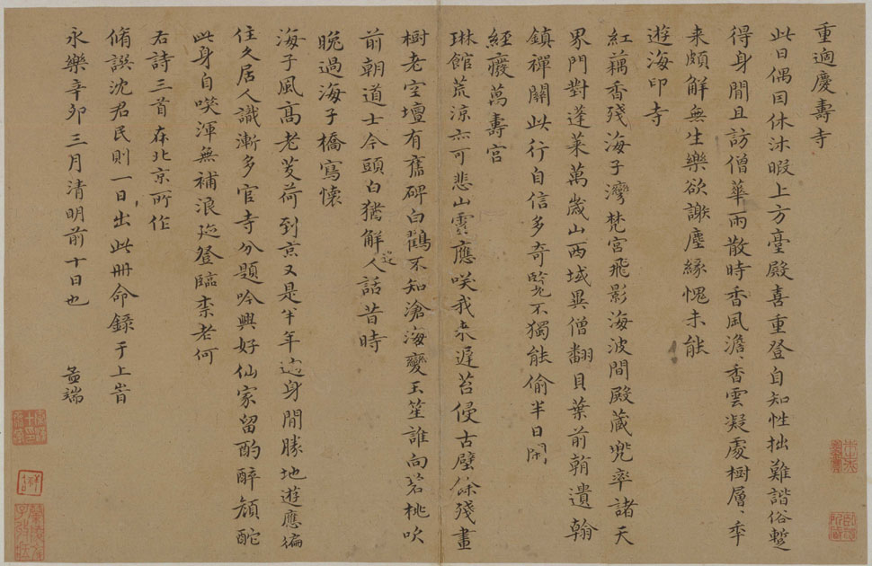 此作小楷书七言诗四首,乃王绂游览京城诸胜景时所成诗篇,并于永乐九年(1411年)为沈度书写。这一年王绂50岁,沈度55岁,二人为内廷同僚。作品以锺、王小楷为法,风格端劲清雅,与当时宫廷中盛行的“台阁体”相比,别具古澹意蕴。