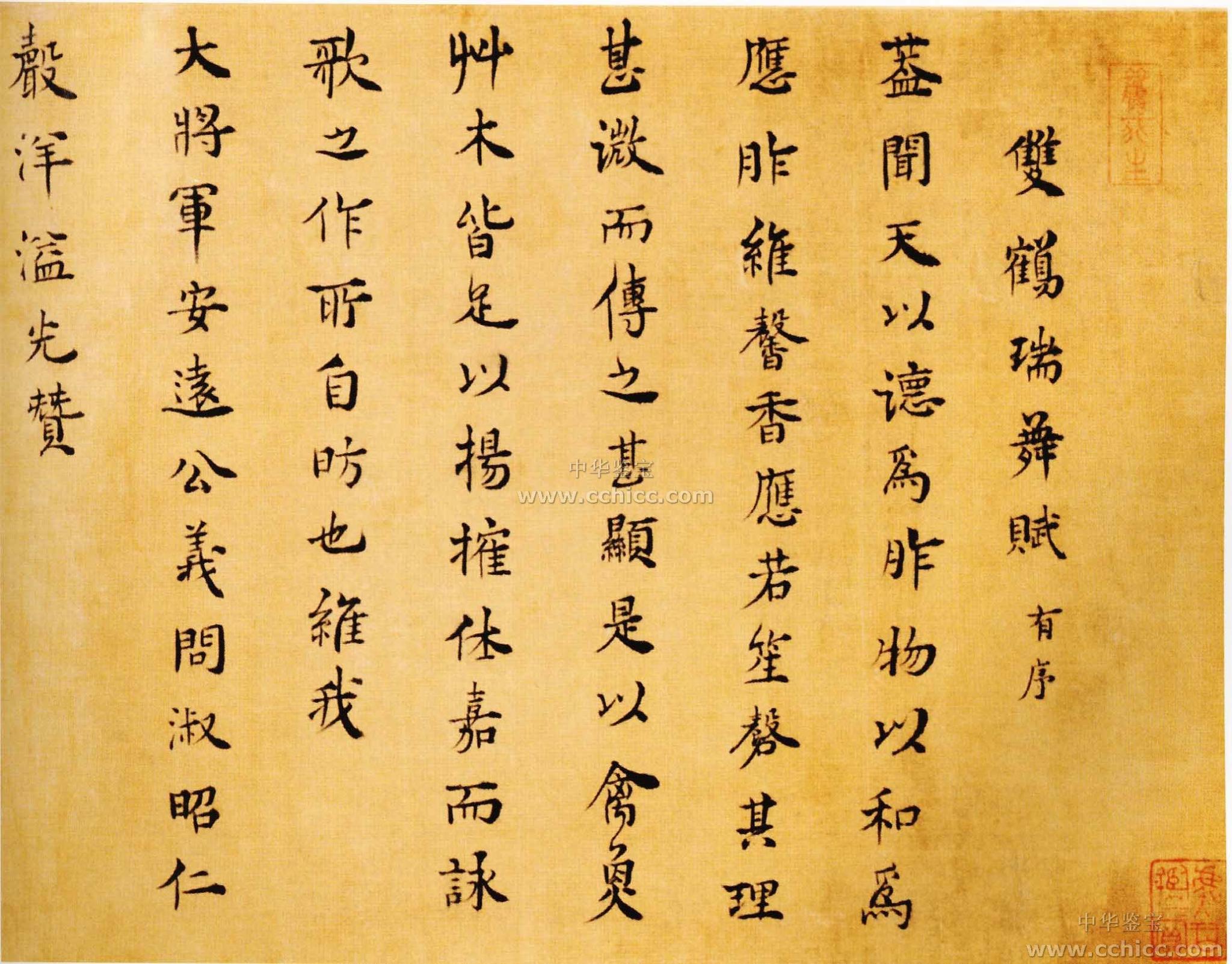 王夫之《楷书双鹤瑞舞赋》卷用笔端雅俊秀,结体俏丽匀整,源自钟、王,尤其受钟繇小楷影响很深,又似倪元璐、黄道周小楷横画末端提顿的欹峭之势。风格高古纯朴,幽雅深奥,疏密得当,刚柔相济,具有浓郁的文人书气息。