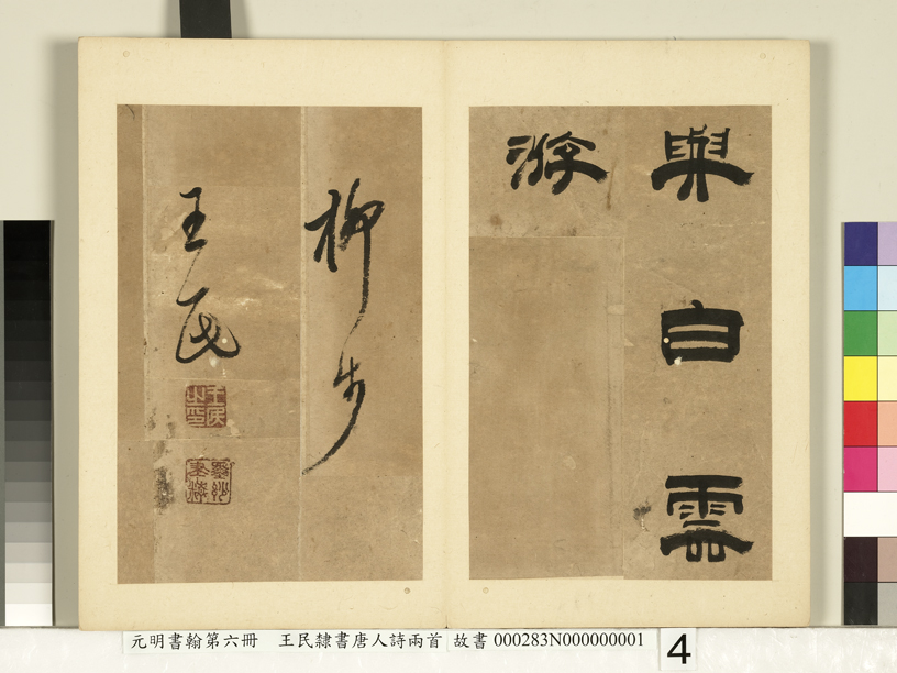 释文:香閣東山下。煙華象外幽。懸燈千嶂夕。捲幔五湖秋。畫壁餘鴻雁。紗窗宿斗牛。更疑天路近。夢與白雲遊。 款署:柳步王民。钤印:王民之印(白文)、墨妙筆精(朱文) 【资料来源】台北故宫博物院网站(故-書-000283-00001)