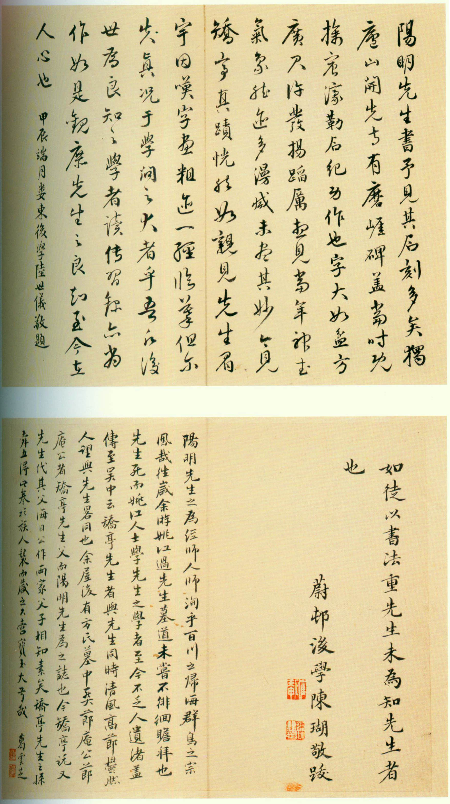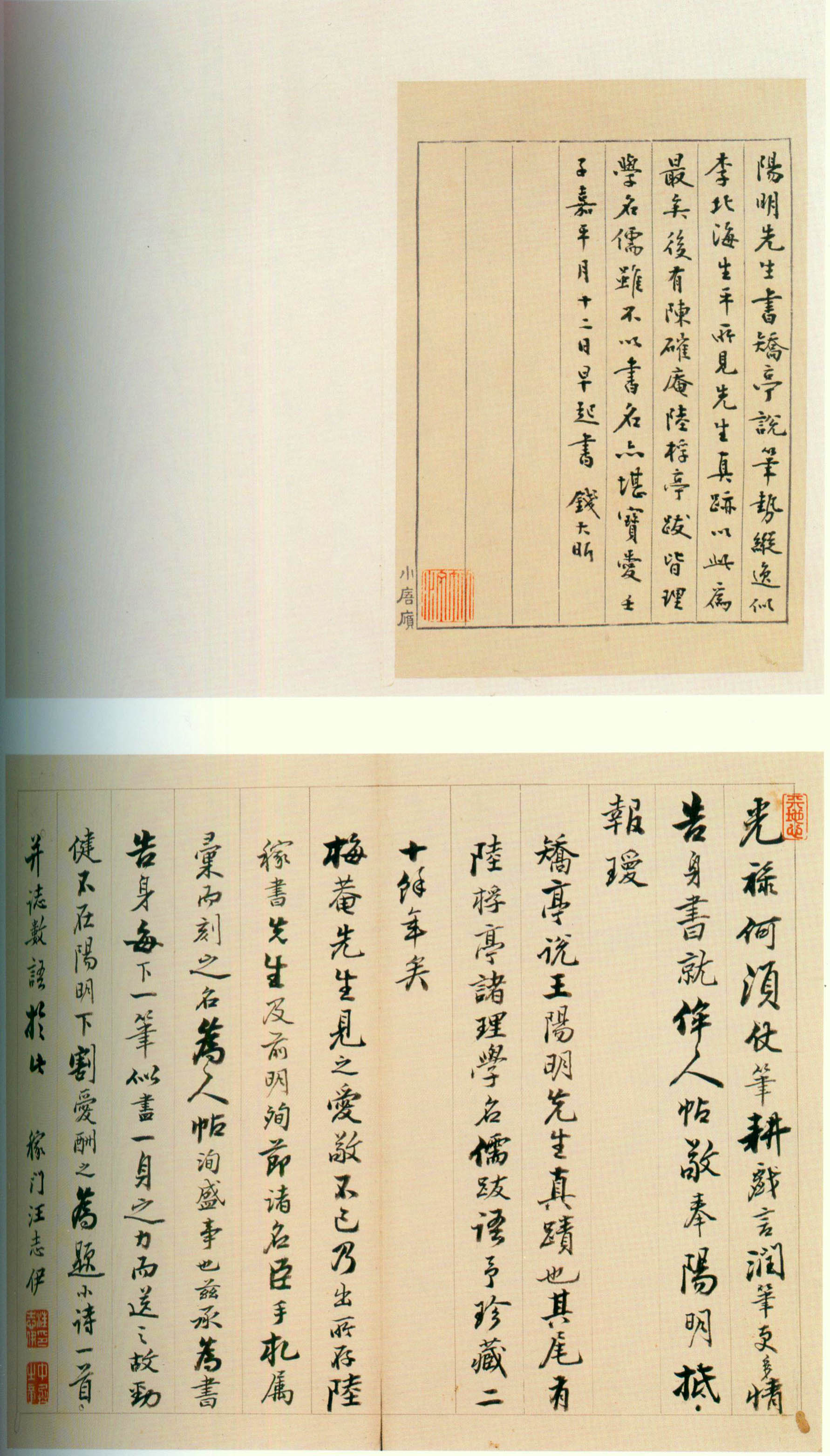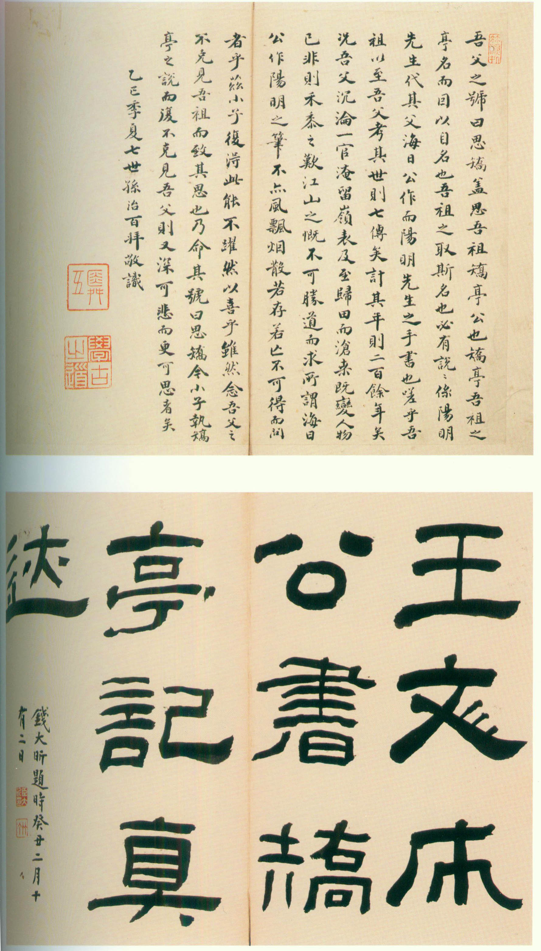 【释文】君子之行顺乎理而已,无所事于偏;偏于柔者,矫之以刚,然或失则傲,偏于慈者,矫之以毅,然或失则刻,偏于奢者,矫之以俭,然或失则陋。凡矫而无节过,过则复为偏,故君子之论学也,不曰矫而曰克,克以胜其私,无过不及矣。矫犹免于意必也,意必于私也,故言矫者未必能尽克己也。矫而复其理,亦克己之道矣。行其克己之实,而以矫名焉,何伤乎?古之君子,其取名也廉,后之君子,实未至而名先之,故不曰克而曰矫,亦矫世之意也。秋卿方君时以“矫”名亭,尝请家君为之说,辄为书之。阳明王守仁识。