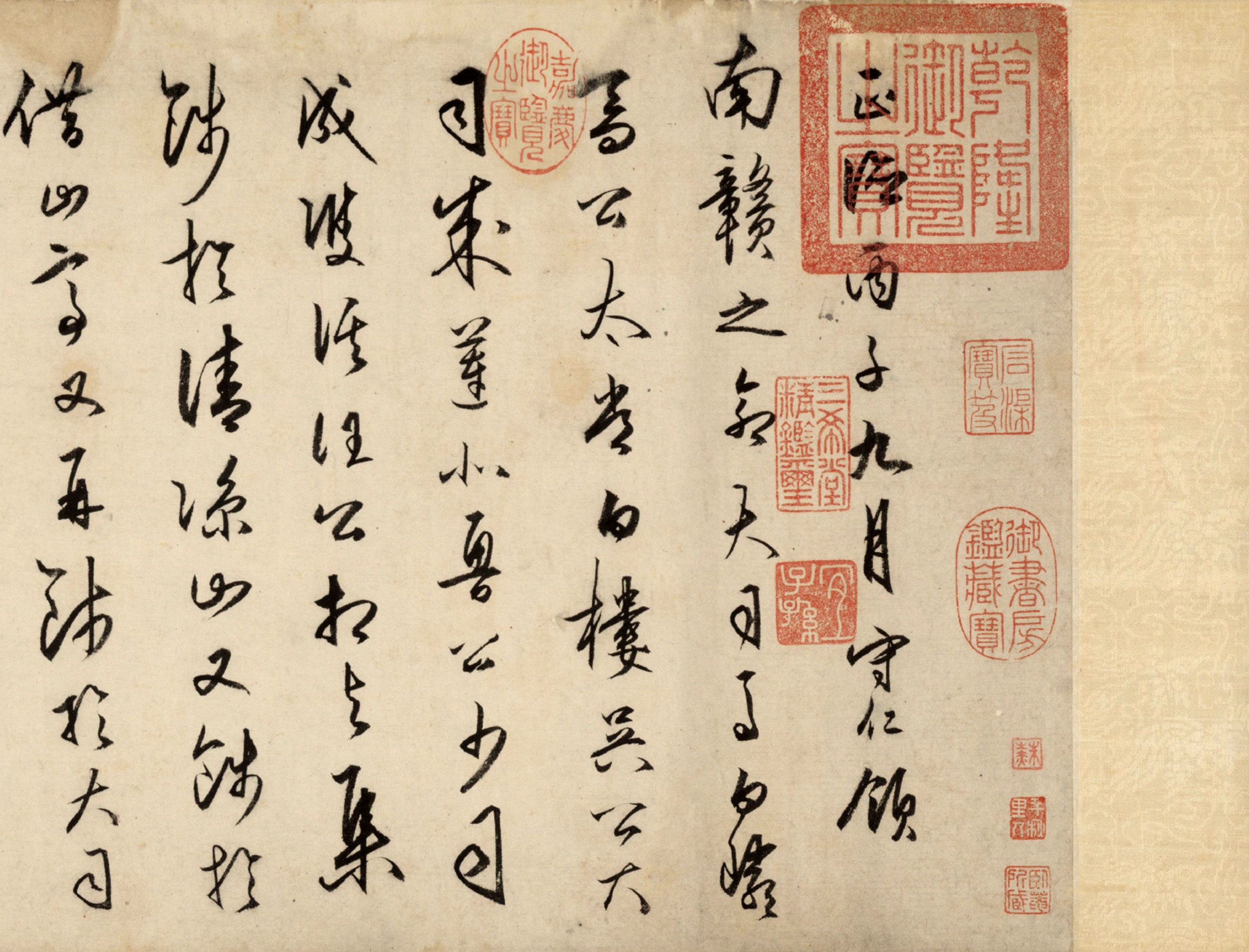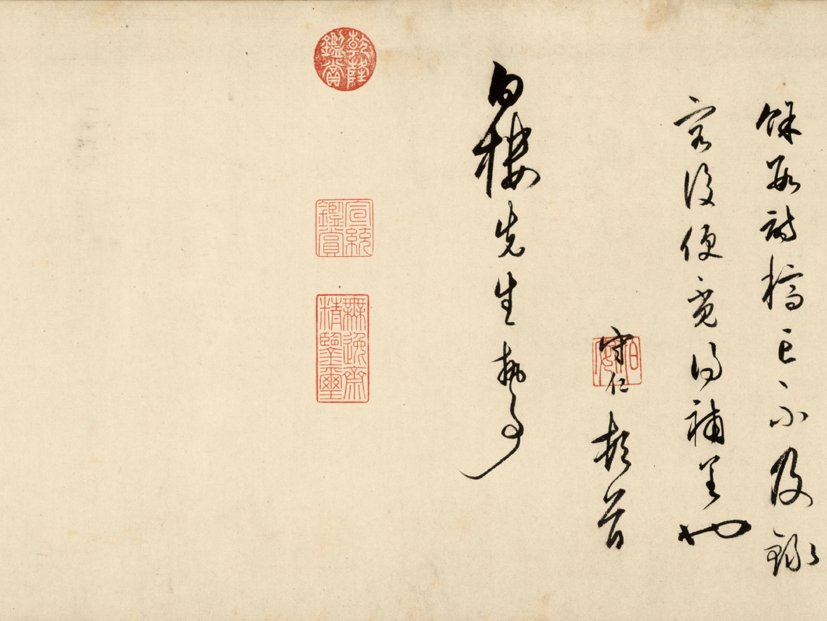 但本幅的书写较為自然,行笔流畅清劲,略无凝滞,线条的粗细浓淡一应自然,字之间也疏朗有致,看不出有一丝感伤之气。本卷乃為其送行友人白楼先生专门书录,是王阳明传世代表作之一,乾隆年间曾刻入《三希堂法帖》。卷中有清初朱之赤及乾隆、嘉庆内府鉴藏印多枚。卷后有朱彝尊题跋。