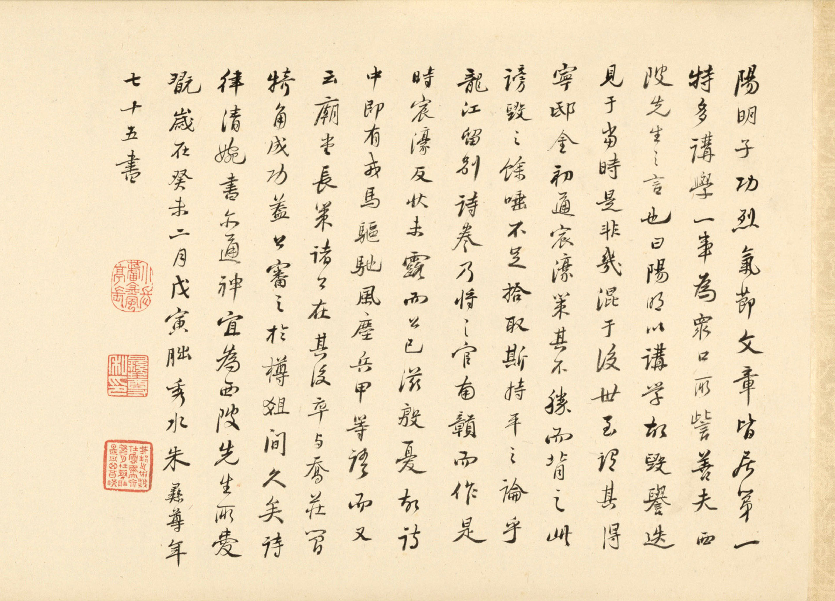 【释文】正德丙子九月,守仁領南贛之命。大司馬白巖喬公、太常白樓吴公、大司成蓮北魯公、少司成雙溪汪公相與集餞於清凉山,又餞於借山亭,又再餞於大司馬第,又出餞於龍江。諸公皆聯句為贈,即席次韻奉酬,聊見留別之意。未去先愁別後思,百年何地更深知。今宵燈火三人爾,他日缄書一問之。漫有煙霞刊肺腑,不堪霜雪妒鬚眉。莫將分手看容易,知是重逢定幾時。謫鄉還日是多餘,長擬雲山信所如。豈謂尚懸蒼水佩,無端又領紫泥書。豺狼遠道休為便,鷗鷺初盟已漸虛。他日姑蘇 歸舊隱,總拈書籍便移居。寒事俄驚蟋蟀先,同遊剛是早春天。故人愈覺晨星少,別話聊憑杯酒延。戎馬驅馳非舊日,筆床相對又何年。不因遠地疏蹤跡,惠我時裁金玉篇。無補涓埃愧聖朝,漫將投筆擬班超。論交義重能相負,惜別情多屢見招。地入風塵兵甲滿,雲深湖海夢魂遥。廟堂長策諸公在,銅柱何年折舊標。孤船渺渺去鍾山,雙闕回看杳靄間。吴苑夕陽臨水別,江天風雨共秋還。離懷遠地書頻寄,後會何時鬢漸斑。今夜夢魂汀渚隔,惟餘梁月照容顏。陽明山人王守仁拜手書於龍江舟中。餘數詩稿亡不及錄。容後便覓得補呈也。守仁 頓首。白樓先生執事。