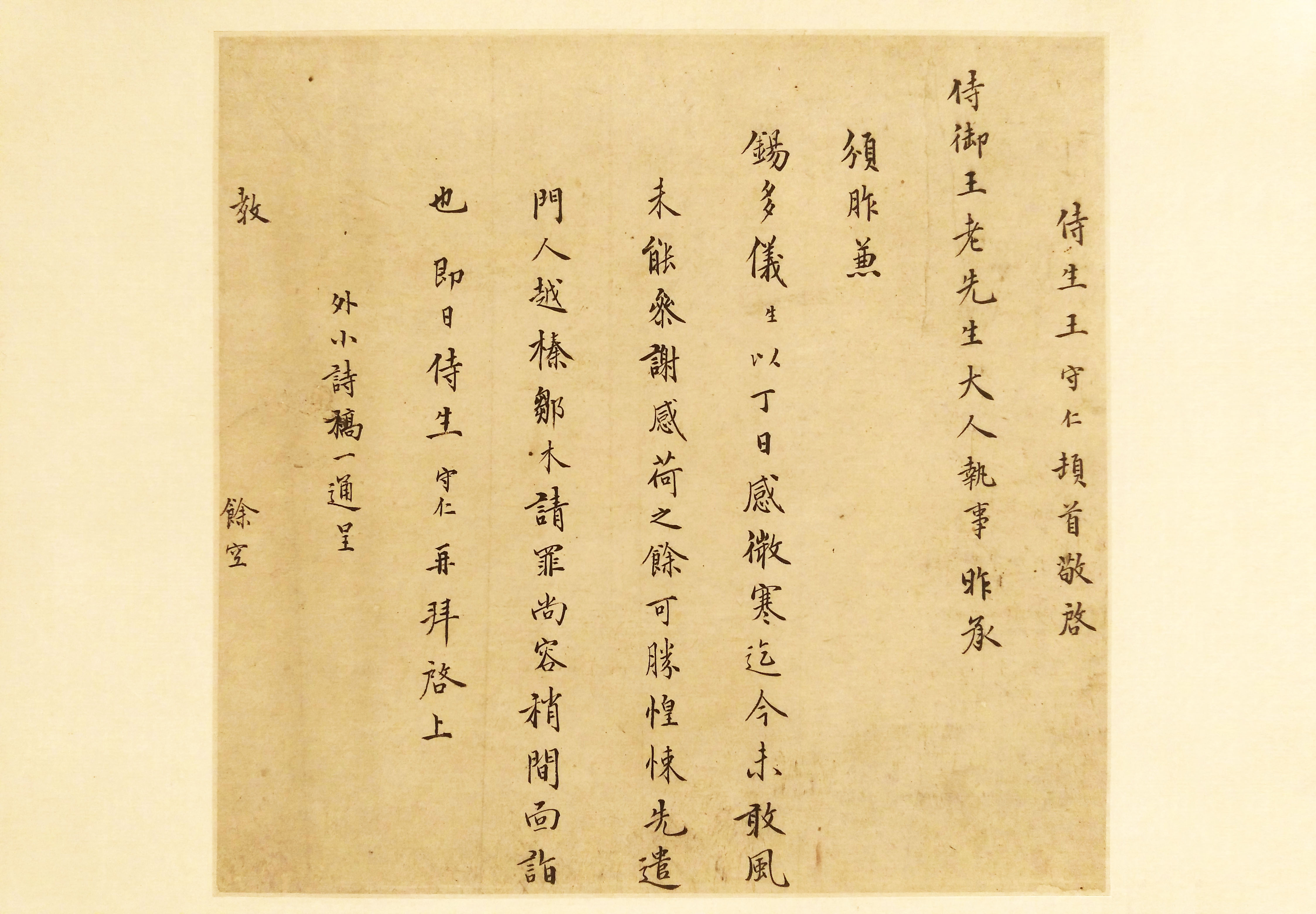 释文:侍生王守仁頓首敬啟。侍御王老先生大人執事。昨承頒胙, 兼錫多 儀。生以丁日感微寒,迄今未敢風,未能參謝。感荷之餘,可勝惶 悚。先遣門人越榛、鄒木請罪,尚容稍間面詣也。即日侍生守仁再 拜啟上。外小詩稿一通呈教。餘空