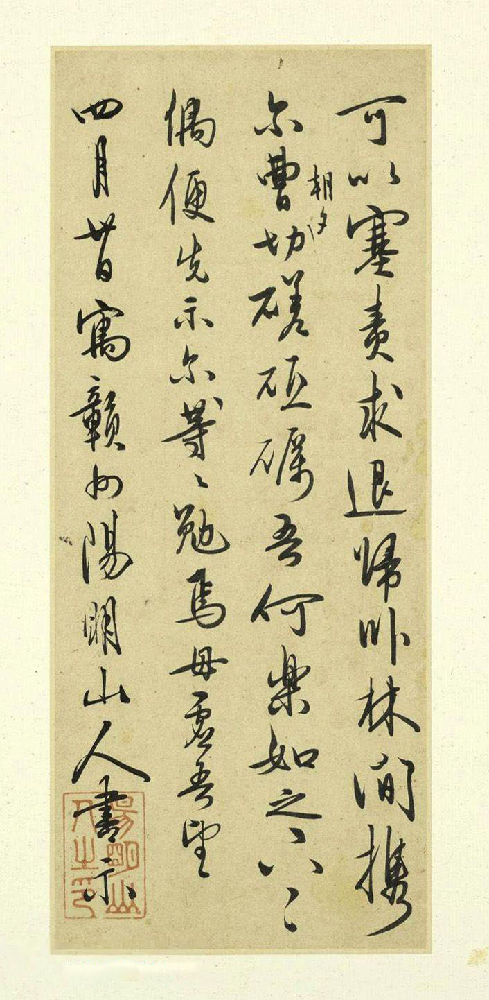 以塞责求退,归卧林间,携尔曹朝夕切磋砥砺,吾何乐如之!偶便,先示尔等,尔等勉焉!毋虚吾望,四月廿日寓赣州阳明山人书示。