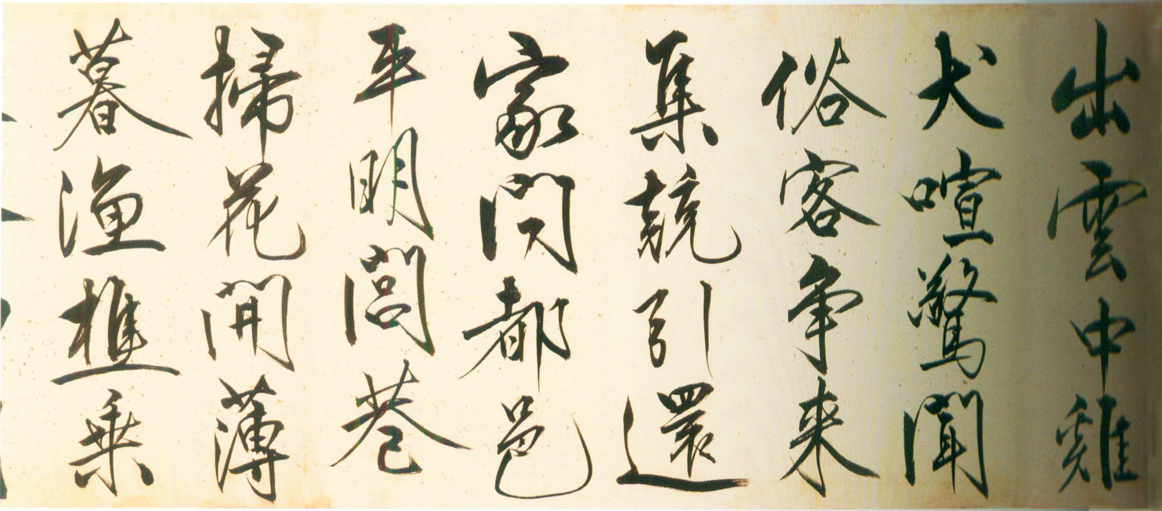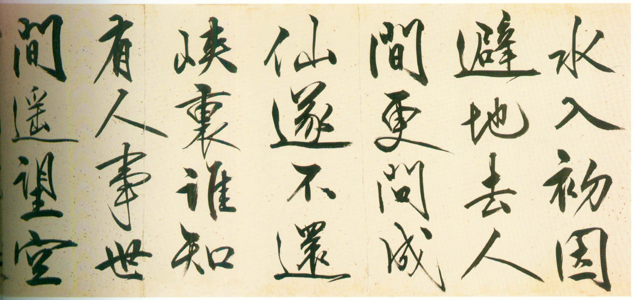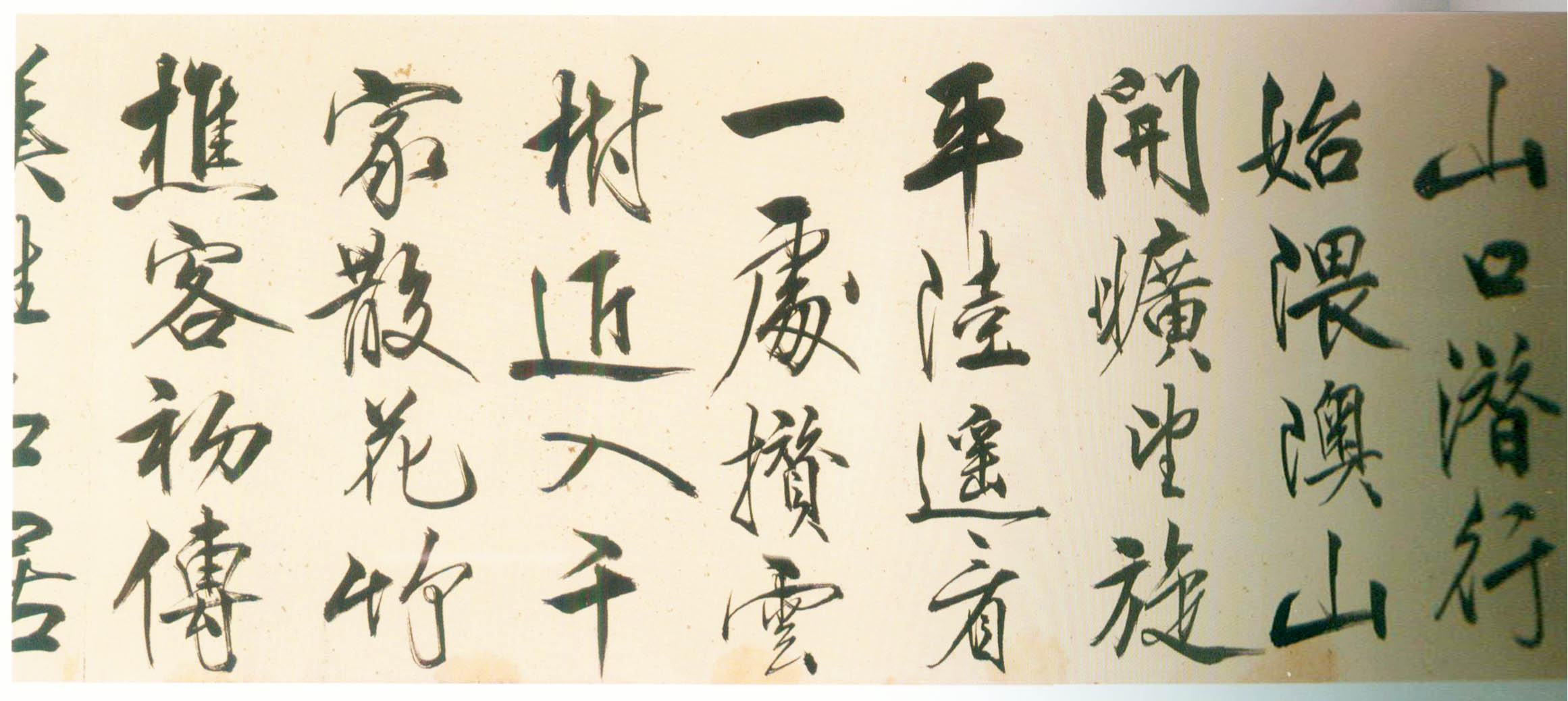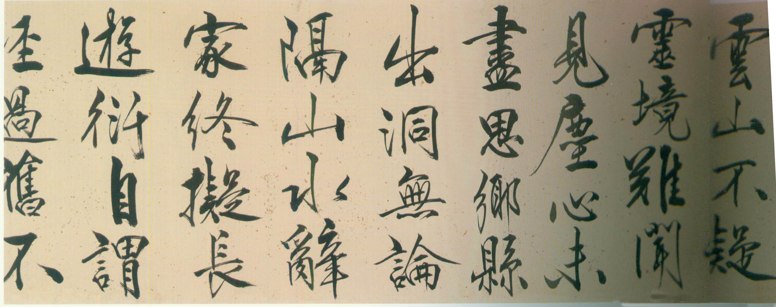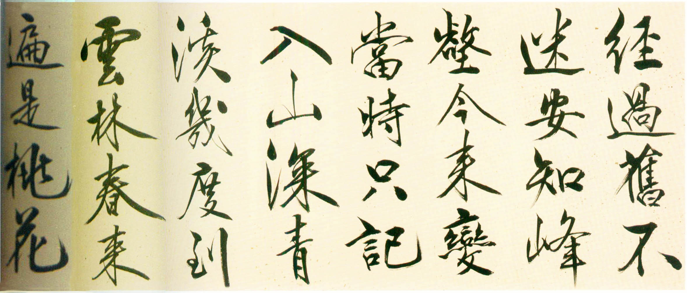 此行书笔画伸展自如,笔锋犀利流畅,一气呵成,有痛快淋漓之感。