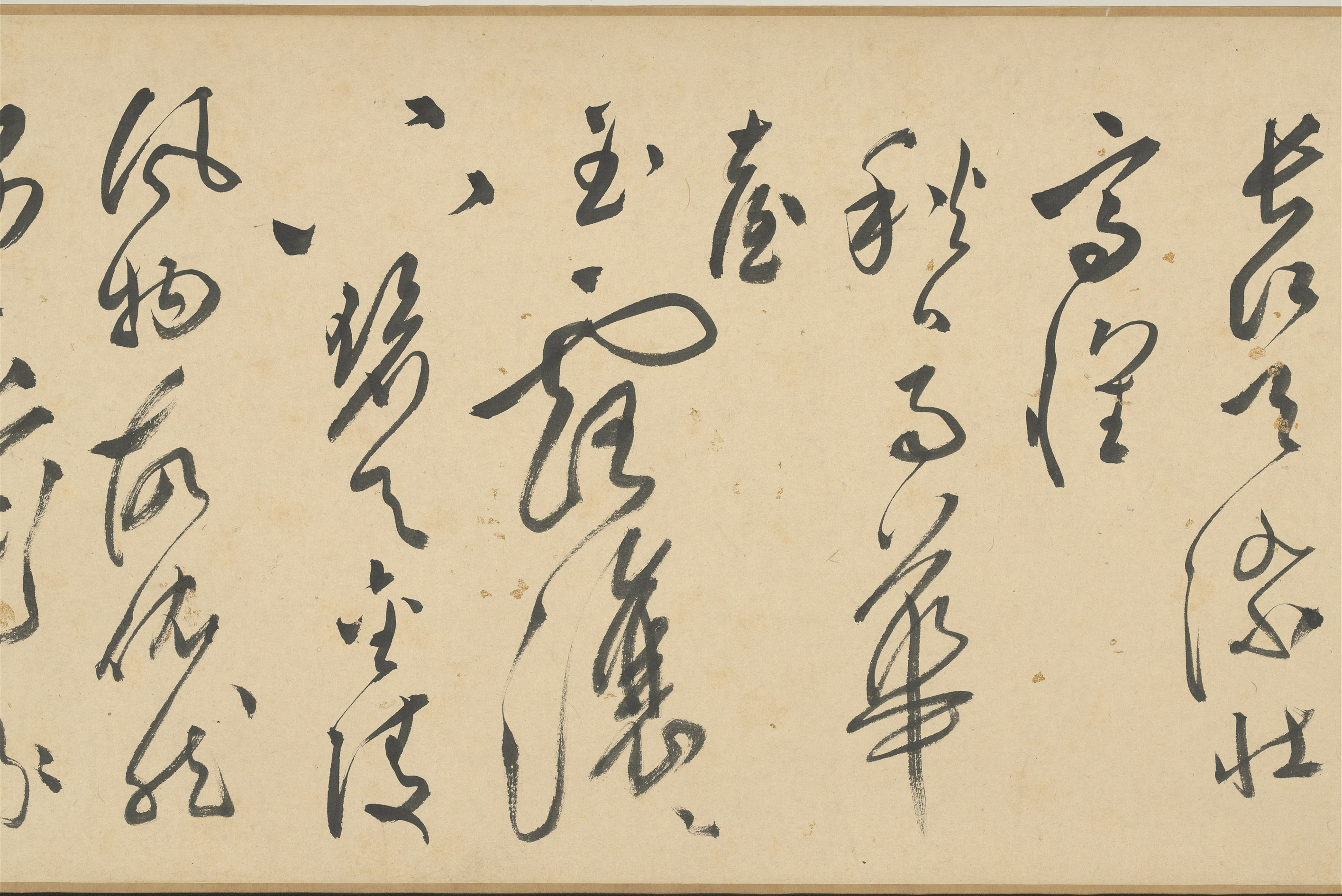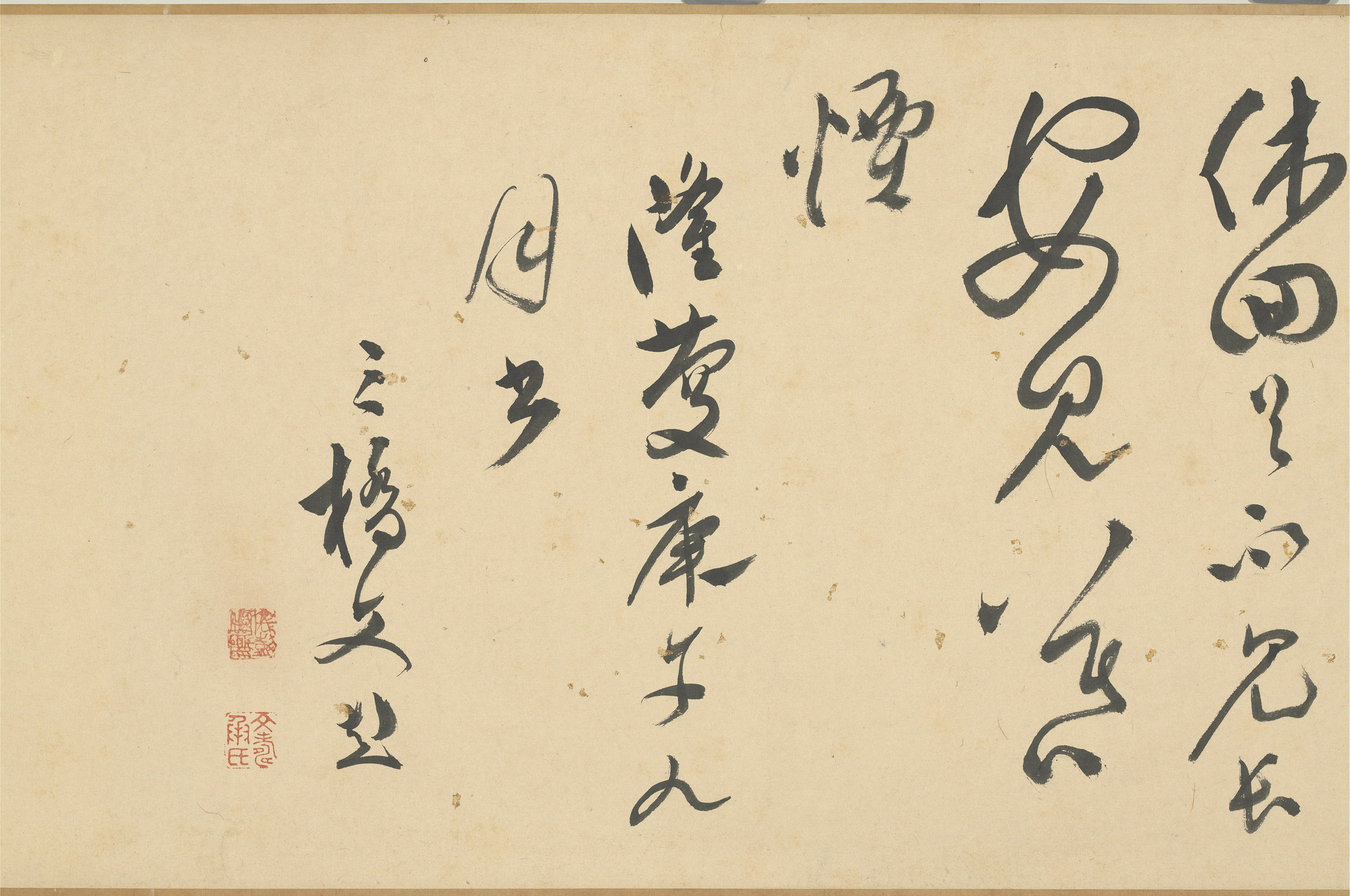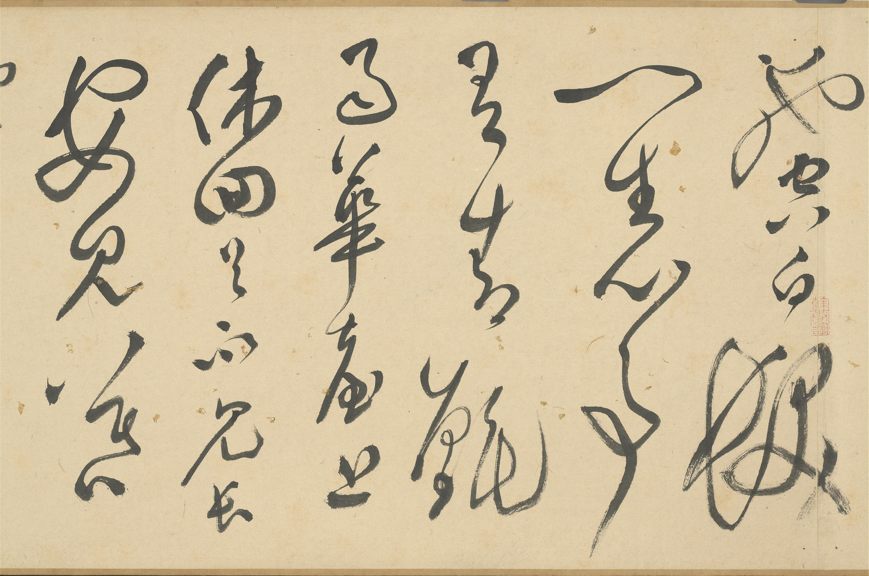 本幅署款“隆庆庚午”(1570),已是文彭晚年所作。对文彭草书的学习进境,怀素《自叙帖》,帖后拖尾文彭有二跋,“低石刻释文。嘉靖壬辰(1532)夏五月望日,雁门文彭书于水镜堂。”“嘉靖庚寅(1530)孟冬获观藏真自叙于陈湖陆氏,谨摹一过。”又文彭书《采莲曲》自题“连日偶读素师自叙,自谓颇有所得,戏书此,以呈墨林。不知以为何如?已未(1559)正月廿又五日。”可见怀素对他影响至深。这件作品就展现出文彭在草书上的造诣,我们从中明显感受他到对怀素的借鉴和吸取。