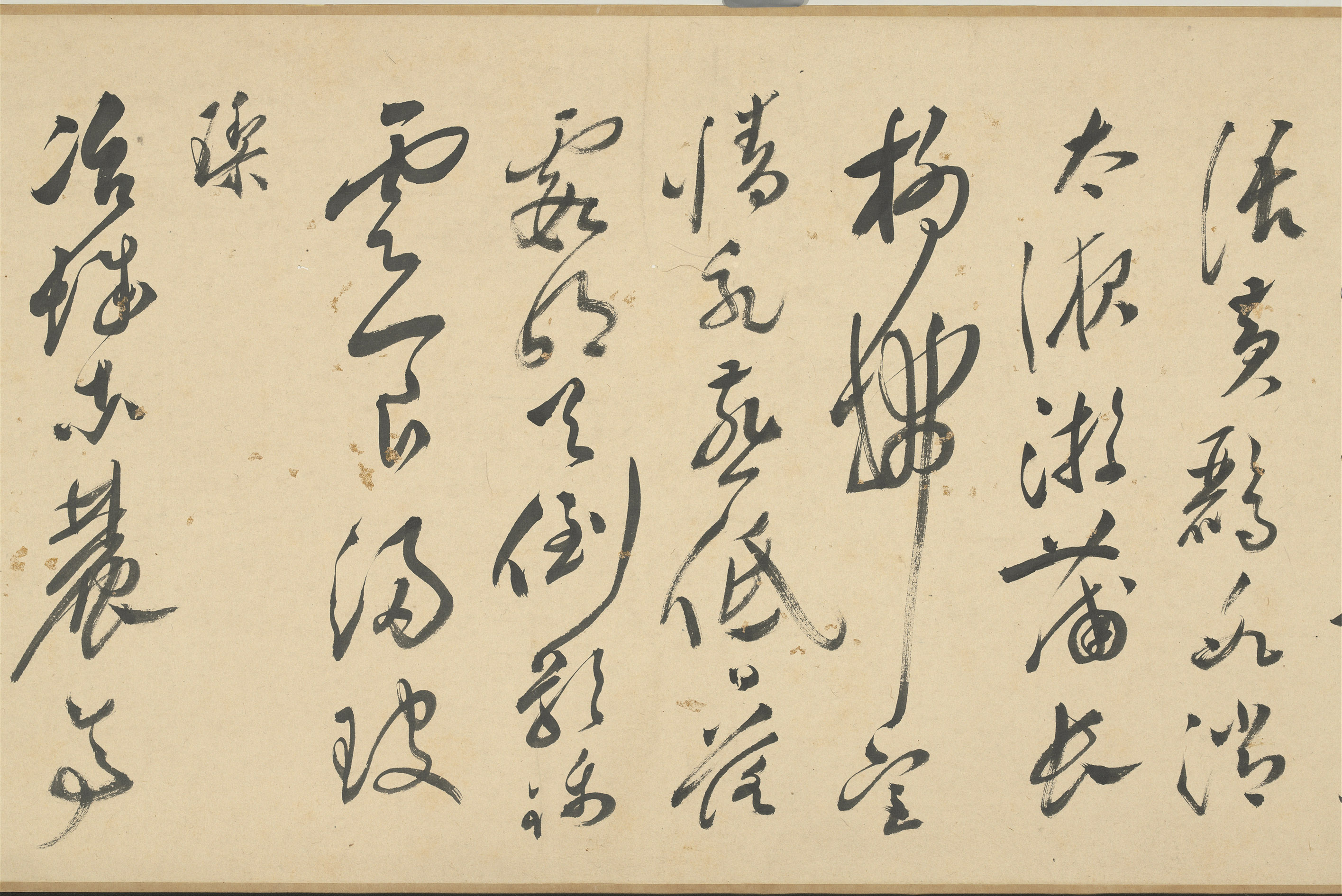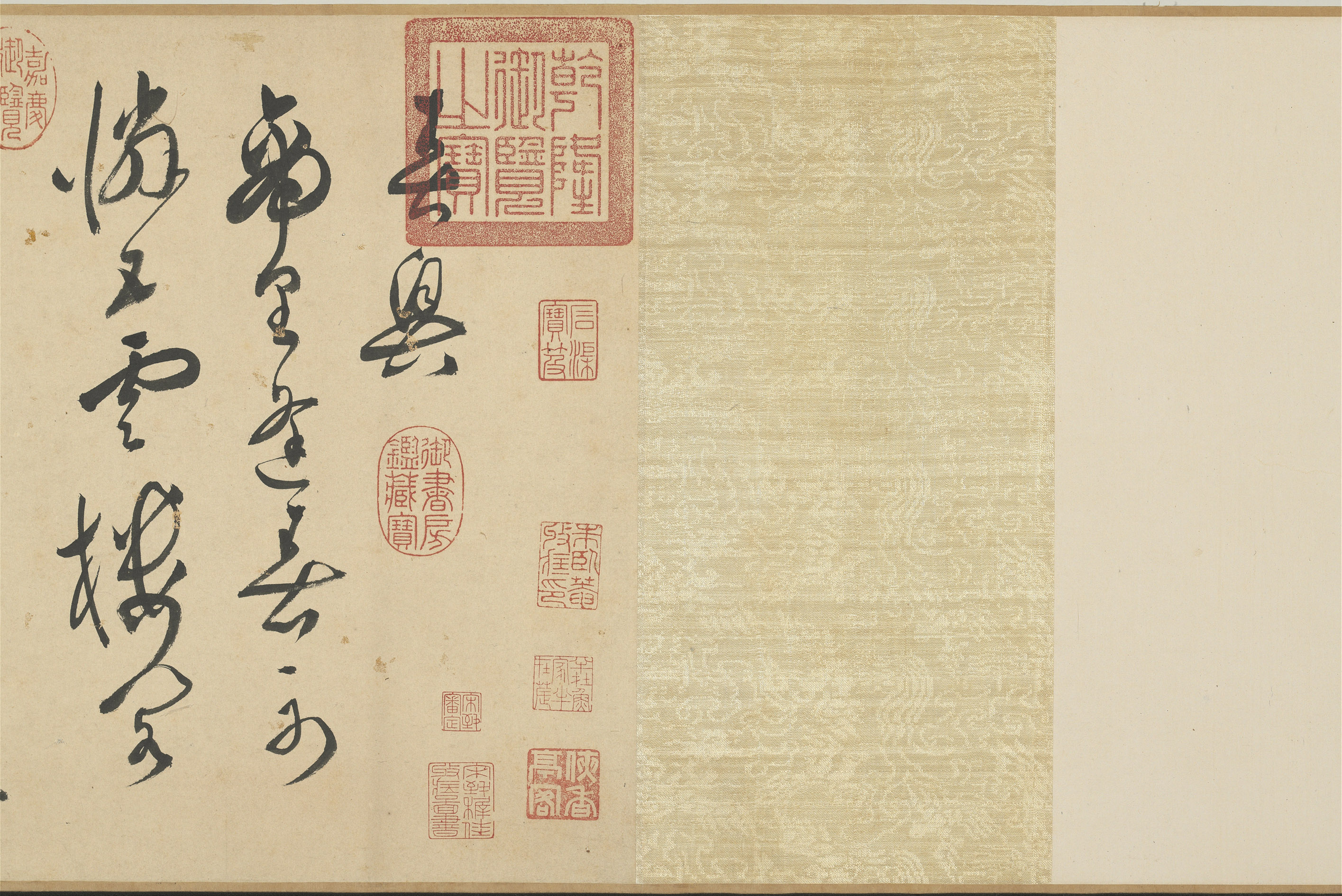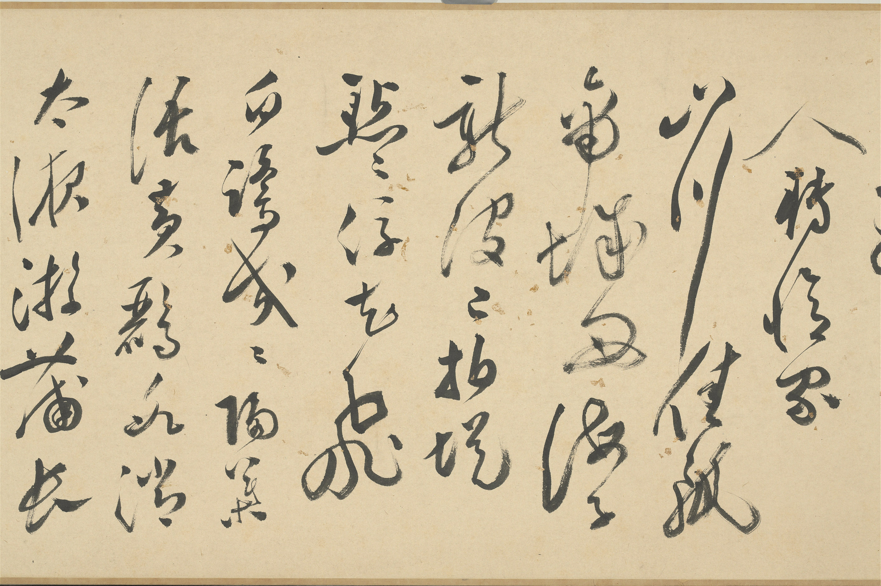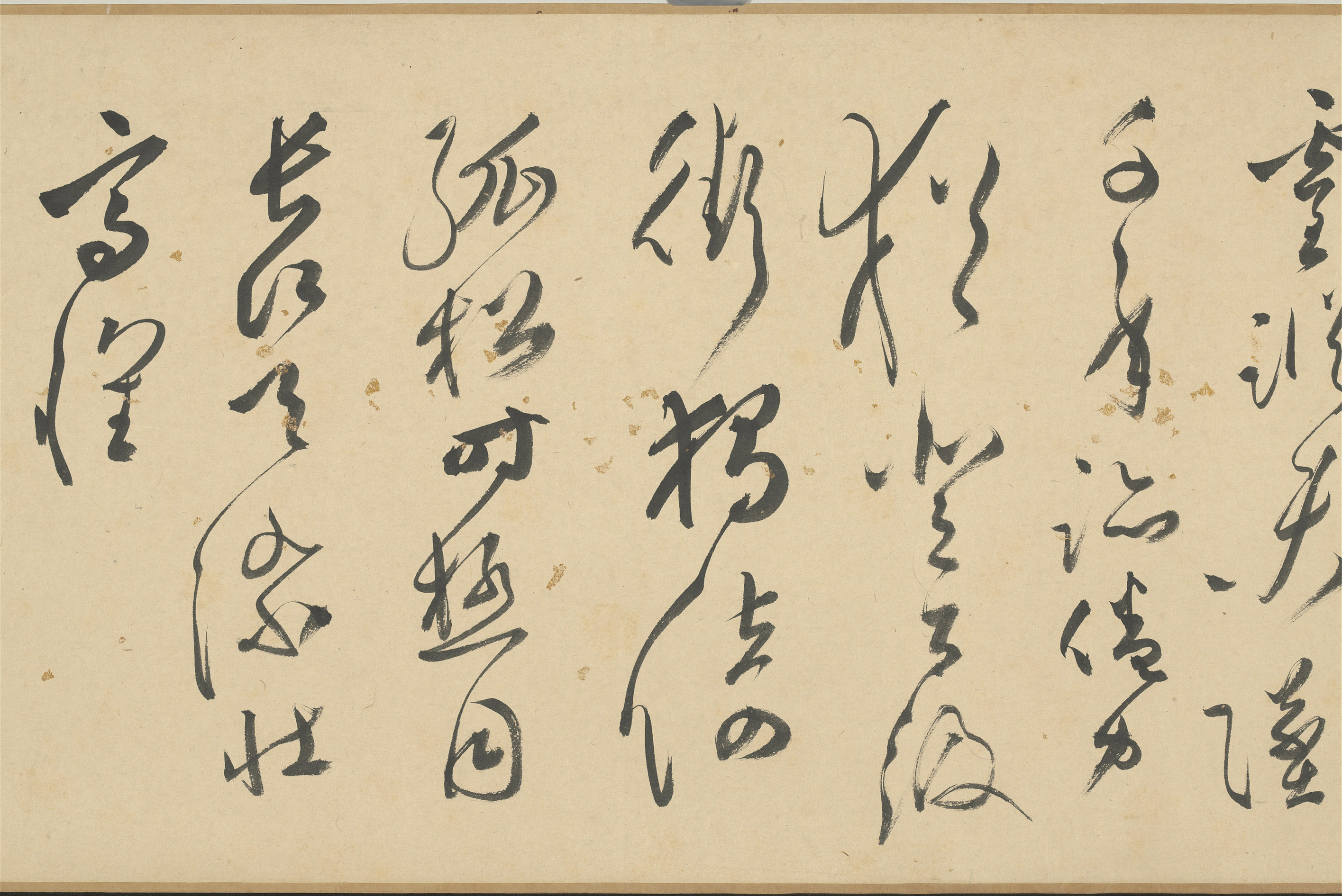 本幅署款“隆庆庚午”(1570),已是文彭晚年所作。对文彭草书的学习进境,怀素《自叙帖》,帖后拖尾文彭有二跋,“低石刻释文。嘉靖壬辰(1532)夏五月望日,雁门文彭书于水镜堂。”“嘉靖庚寅(1530)孟冬获观藏真自叙于陈湖陆氏,谨摹一过。”又文彭书《采莲曲》自题“连日偶读素师自叙,自谓颇有所得,戏书此,以呈墨林。不知以为何如?已未(1559)正月廿又五日。”可见怀素对他影响至深。这件作品就展现出文彭在草书上的造诣,我们从中明显感受他到对怀素的借鉴和吸取。