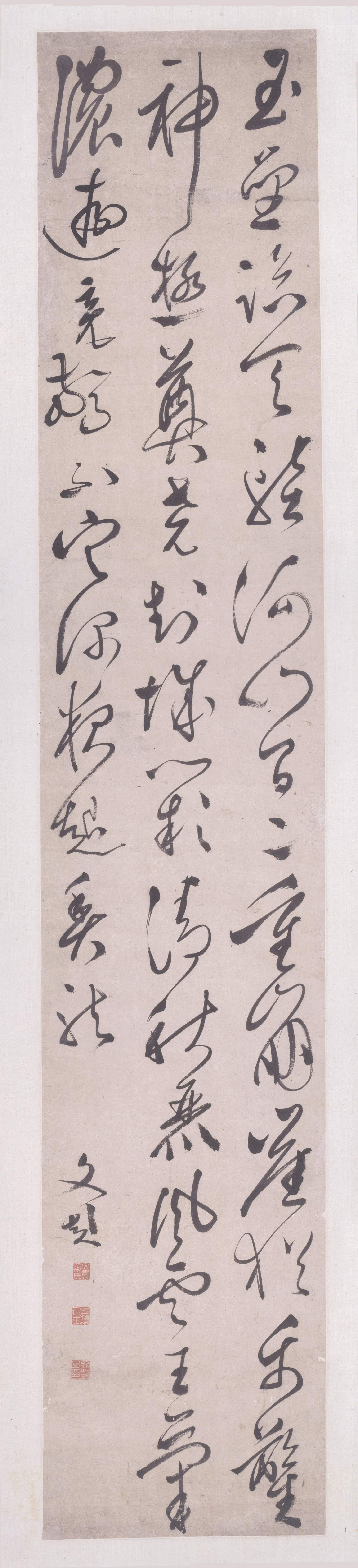 释文:玉垒临天堑,河山百二重。崩崖犹禹凿,神极奠尧封。城阙清秋丽,风云王气浓。游魂惊不定,深夜期鱼龙。 款识:文彭。 钤印:文寿承氏(白文)、三桥居士(白文)、文彭之印(白文)