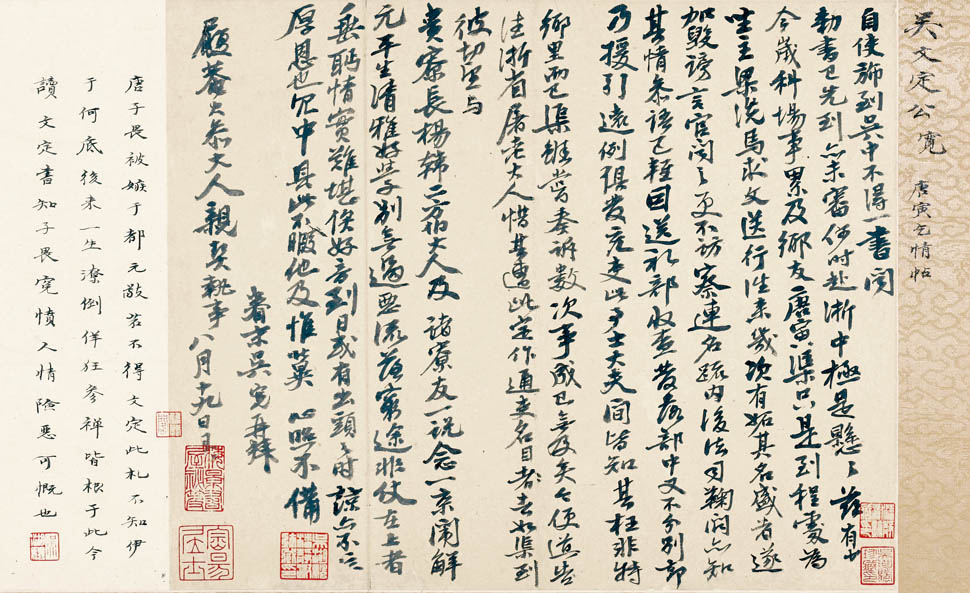 吴宽这通书札,曾经吴湖帆收藏,他将其定名为《唐寅乞情帖》。书札的内容涉及了明代著名的弘治科场弊案。弘治十二年,唐寅挟解元之名参加会试,在考试前与主考官之一程敏政有所往来。试后程敏政被人弹劾收受唐寅及其同伴徐经的贿赂,案件牵连广大,满城风雨,最后查无实据,不了了之。唐寅被拘问后发落到浙江充当吏役。吴宽是唐寅的同乡,其时在京为官,得知后写信给浙江的同僚,请求他照顾即将到来的唐寅。信中吴宽言辞恳切,一再为唐寅申辩冤屈,流露出对其无限的同情与惋惜。 这通信札既能看出吴宽对后辈的关怀与爱护,也反映出了苏州文人提携后辈、爱才惜才的风气,这也是吴门得以聚集人才,形成一个影响广大的艺术流派的原因之一。 吴宽书学苏轼,意态宽和,颇有法度。从书法上看,整通信札字距绵密,字迹紧凑,点划微腴而提按自然,墨色由浓而淡,可以看出吴宽书写时的急切之情。