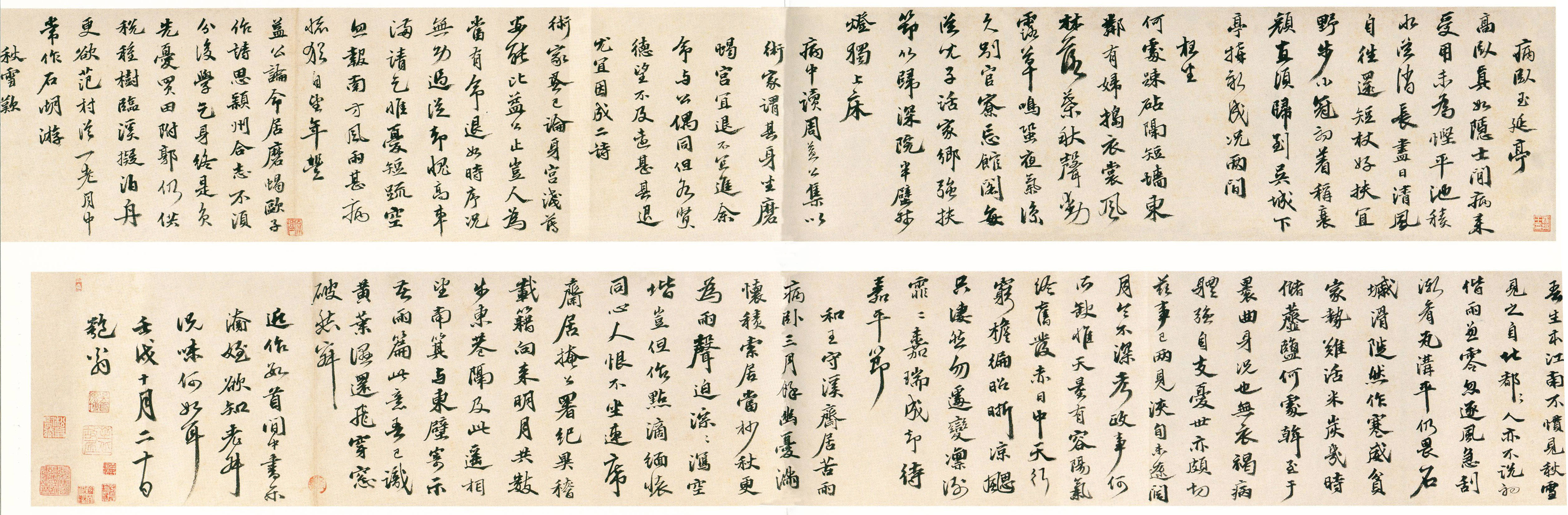 吴宽《行书自书诗卷 》纸本 22.8×309cm 1502年 天津博物馆藏 作于明弘治食物年(1502)。纸本。时68岁,时吴宽晚年代表作。