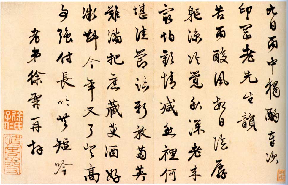 书自作七言律诗《雨中独酌》一首,表露了老年人的伤感情怀。款署“老弟徐霖再拜”,钤“徐氏子仁”(白文)、“快